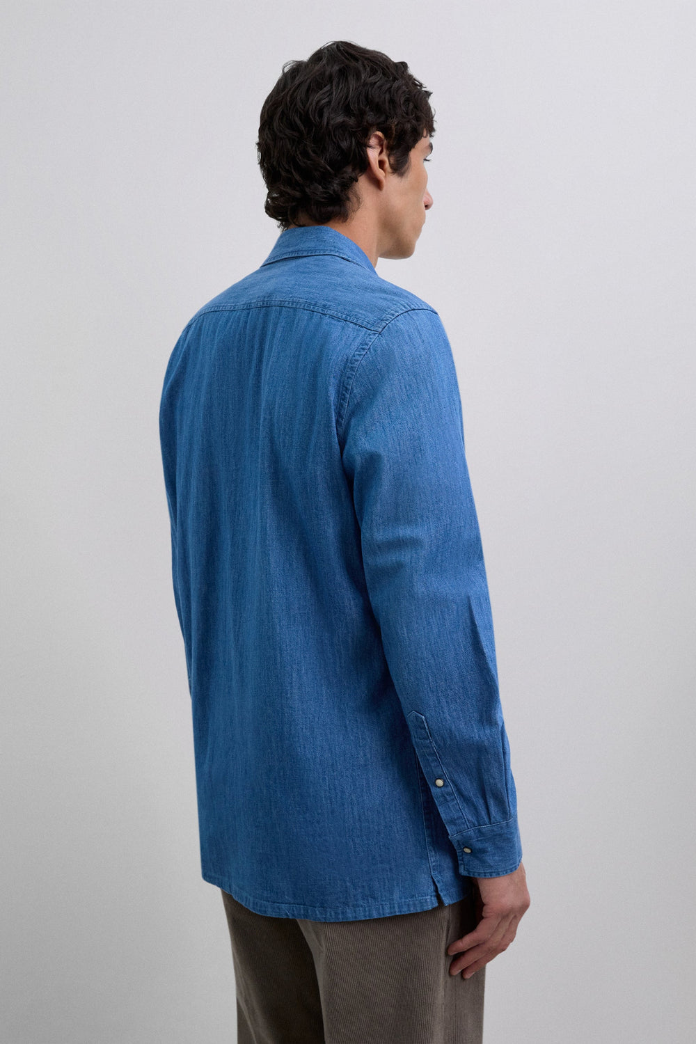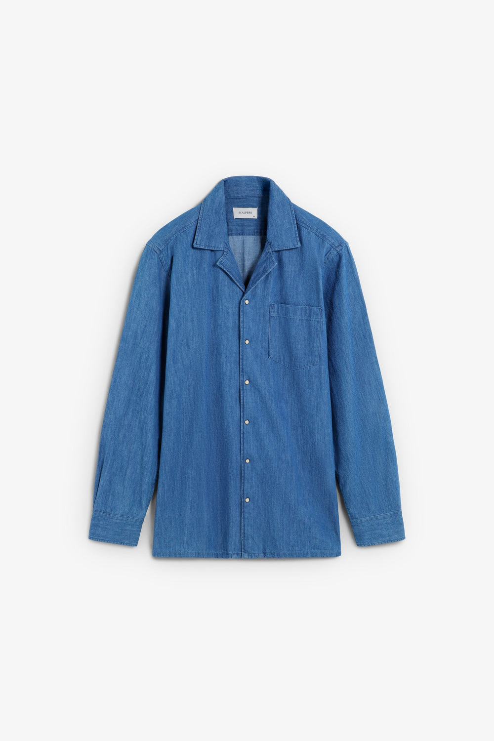 Chemise denim confectionnée en 100 % coton BCI. Coupe droite. Col chemise. Boutonnée devant. Manches longues. Poignets boutonnés. Poche au niveau de la poitrine. Logo brodé sur la patte de boutonnage.