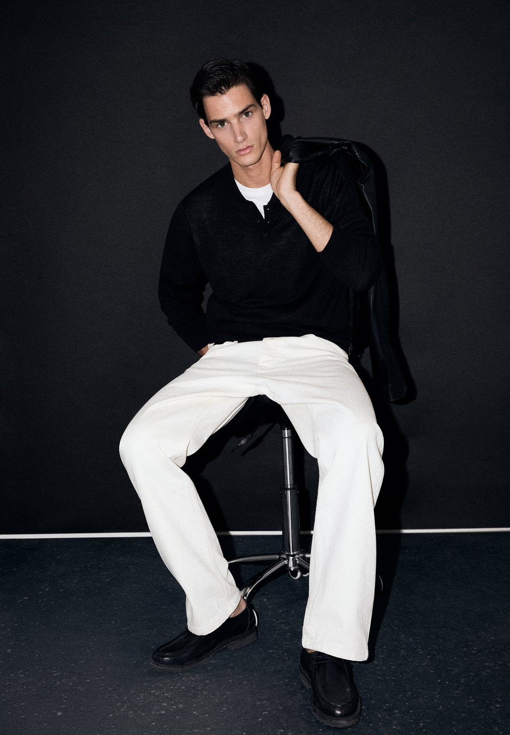 Pull 100 % laine. Manches longues. Col polo. Fermeture boutonnée.