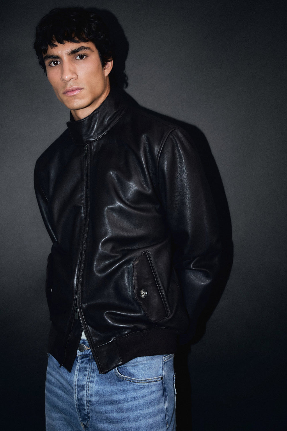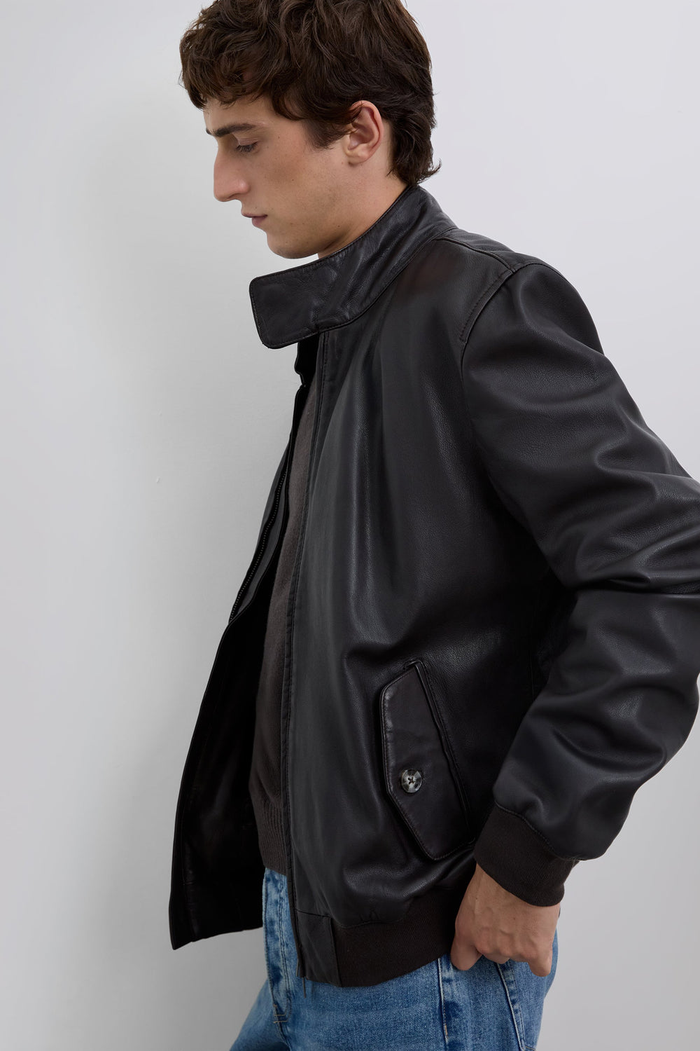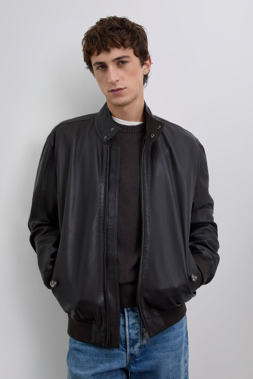 Veste 100 % cuir. Manches longues. Fermeture Éclair double curseur sur le devant. Col montant à double bouton-pression. Deux poches à rabat boutonné devant. Poignets et ourlets côtelés.