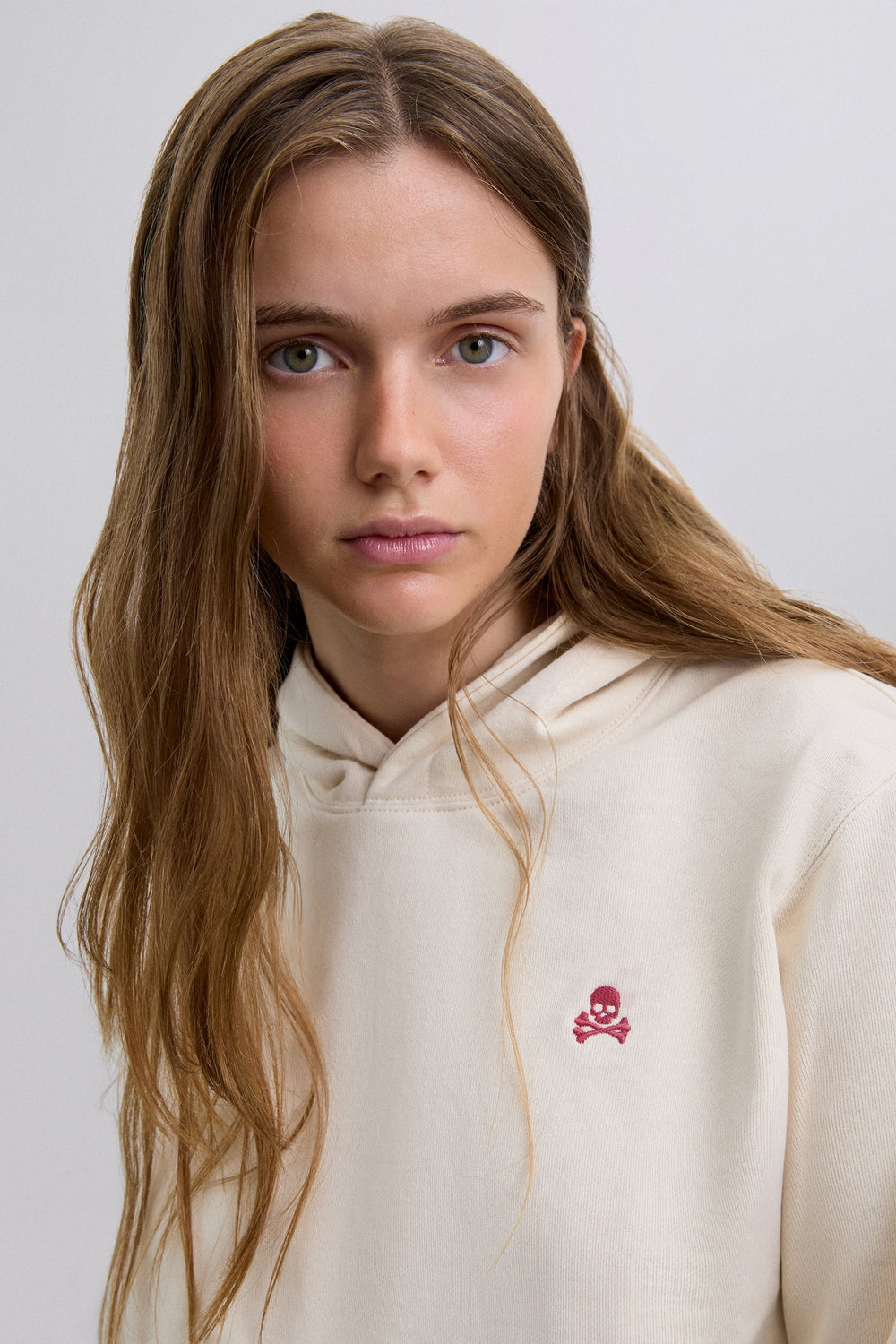 Sweatshirt with hood made of 100% BCI cotton. Long sleeves. Contrast embroidered skull detail on the chest and embroidered logo on the back. Front pocket pouch pocket with contrast logo detail. Ribbed trim on waistband and cuffs.