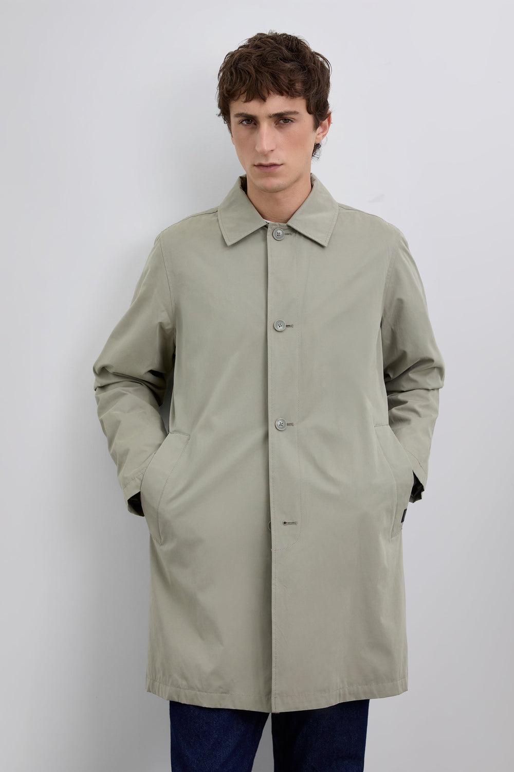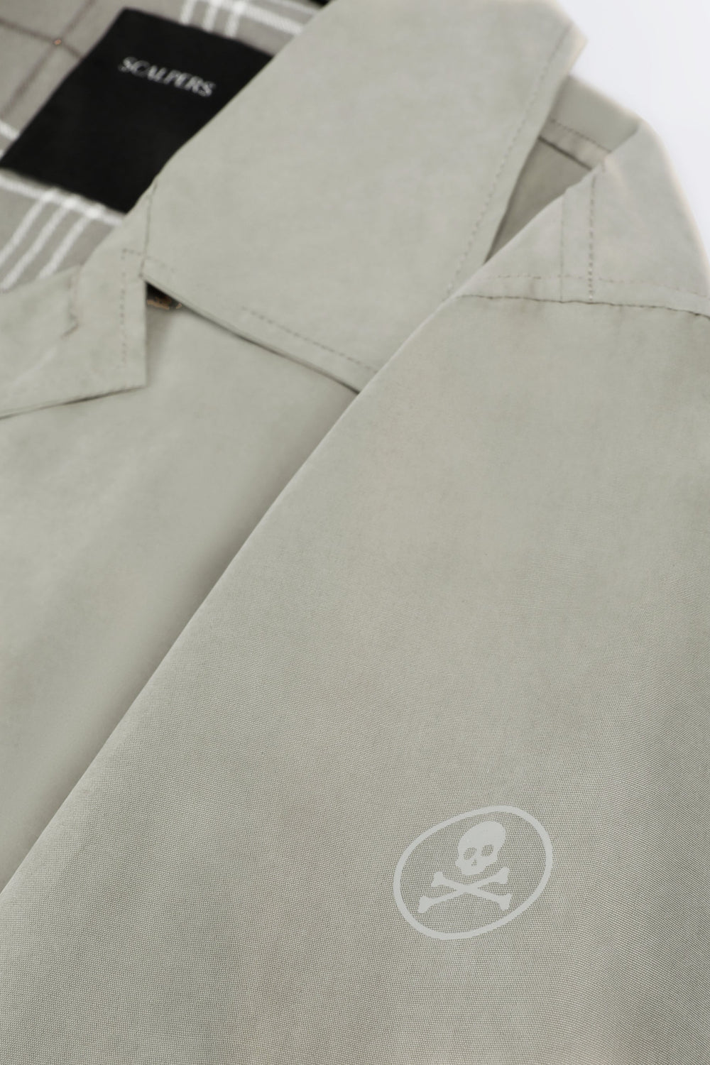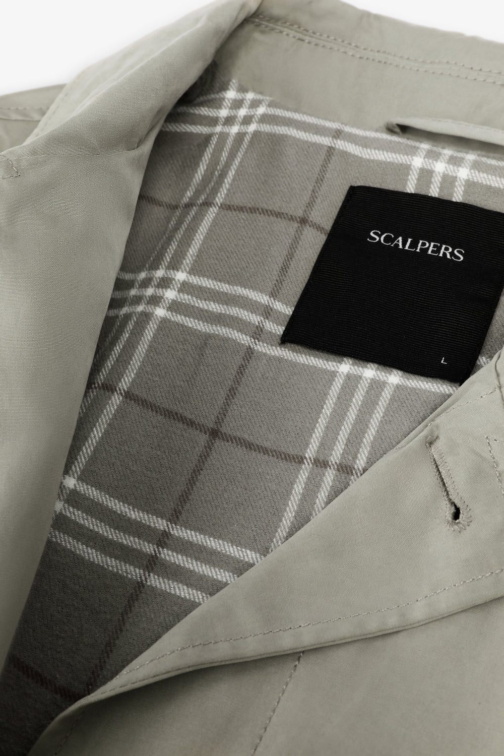Trench coat with front button fastening. Shirt collar. Two front slant pockets. Stitching details along the length of the garment. Front button fastening. Checked lining. Logo label detail on pocket and inside pocket and skull print on sleeve.