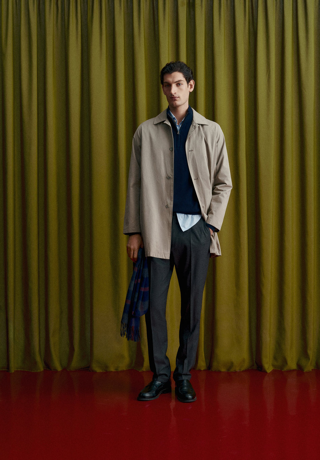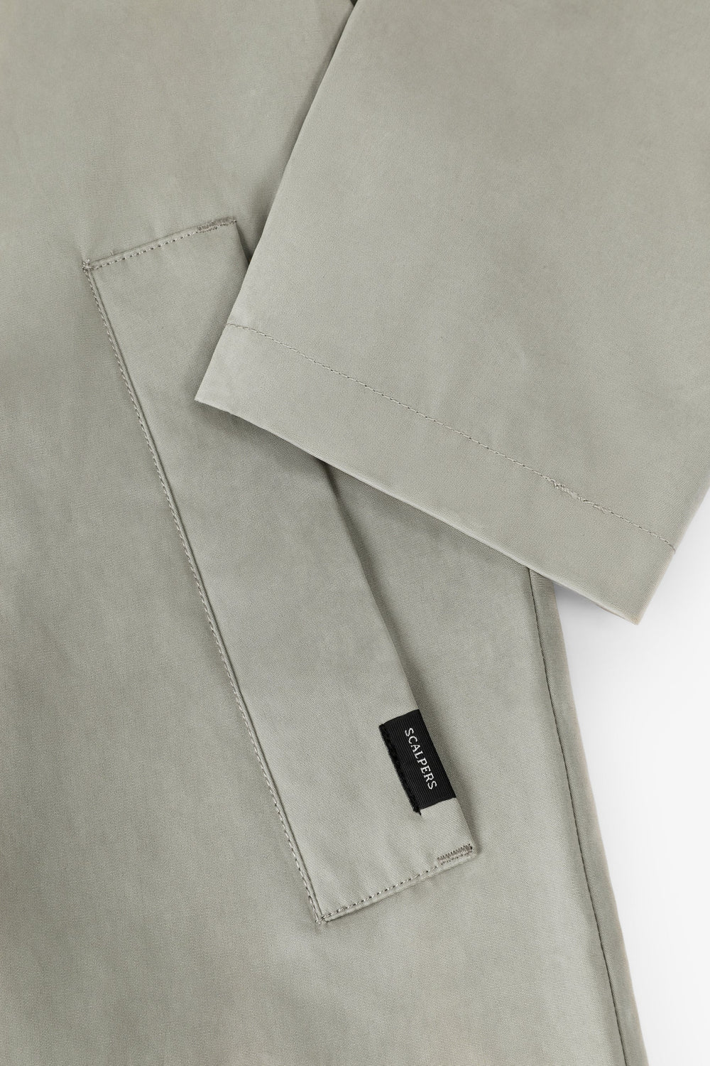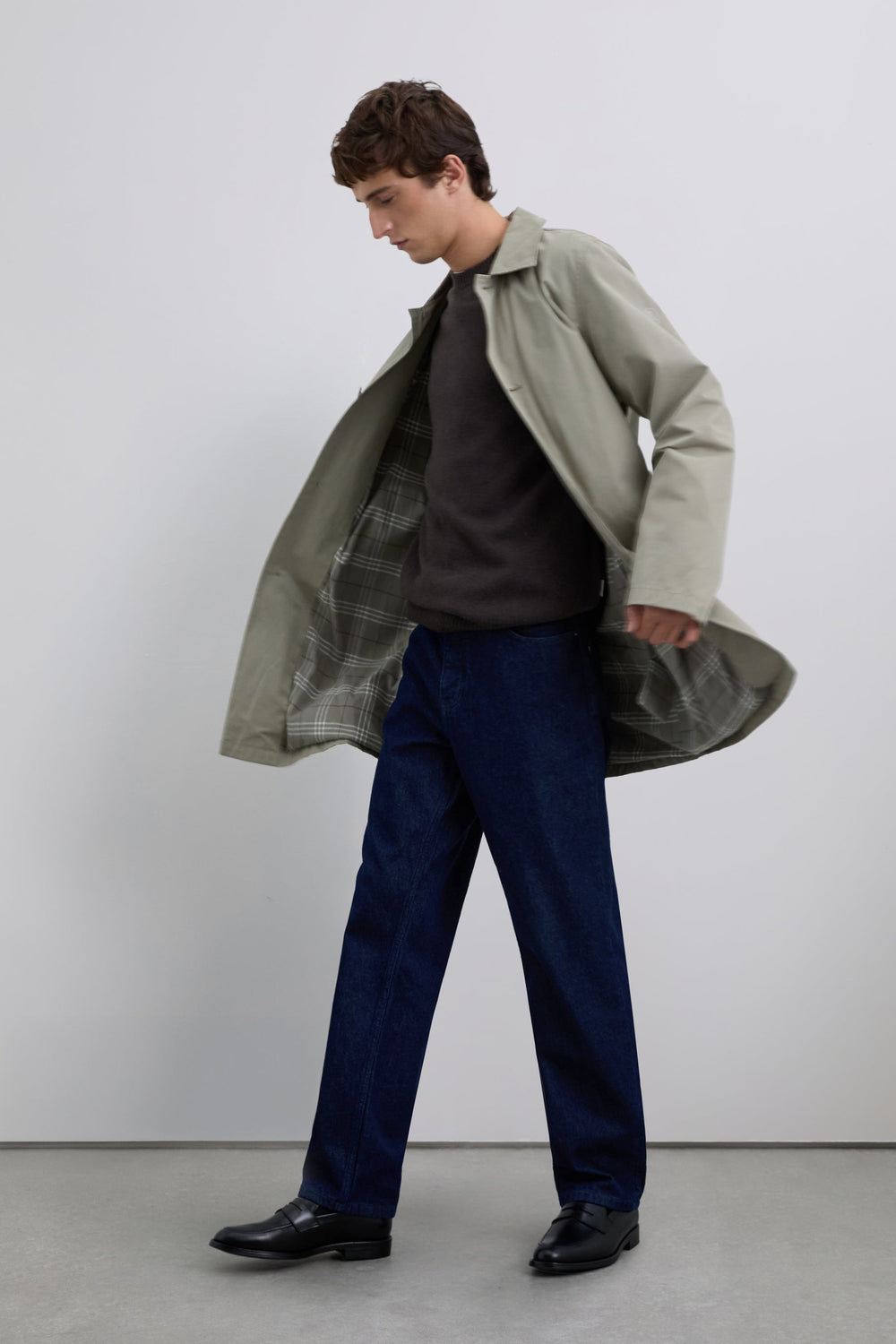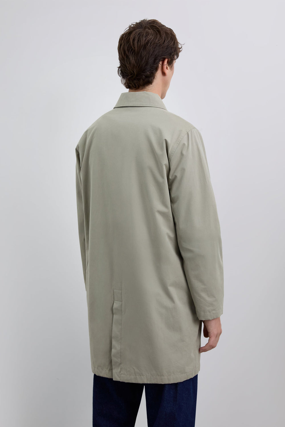 Trench coat with front button fastening. Shirt collar. Two front slant pockets. Stitching details along the length of the garment. Front button fastening. Checked lining. Logo label detail on pocket and inside pocket and skull print on sleeve.
