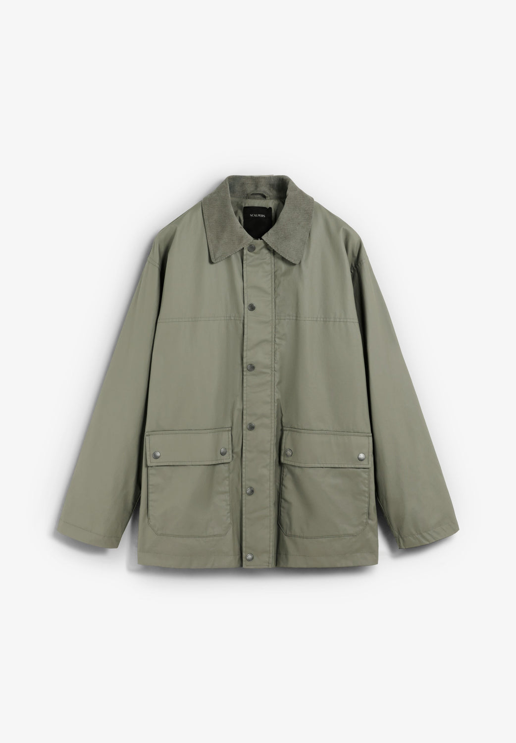 Jacket made of 100% BCI cotton. Waxed effect fabric. Two front pockets. Corduroy detail on collar and inside pocket. Front zip fastening concealed by placket with press-studs.