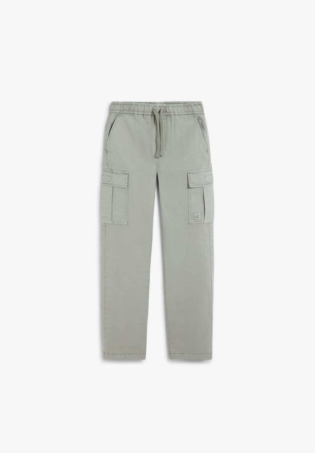 Pantaloni militari realizzati in misto cotone. Vita elastica con laccio regolabile. Tasche laterali con patta e tasche posteriori. Gamba dritta.
