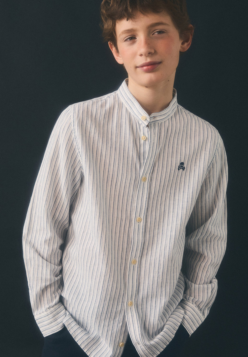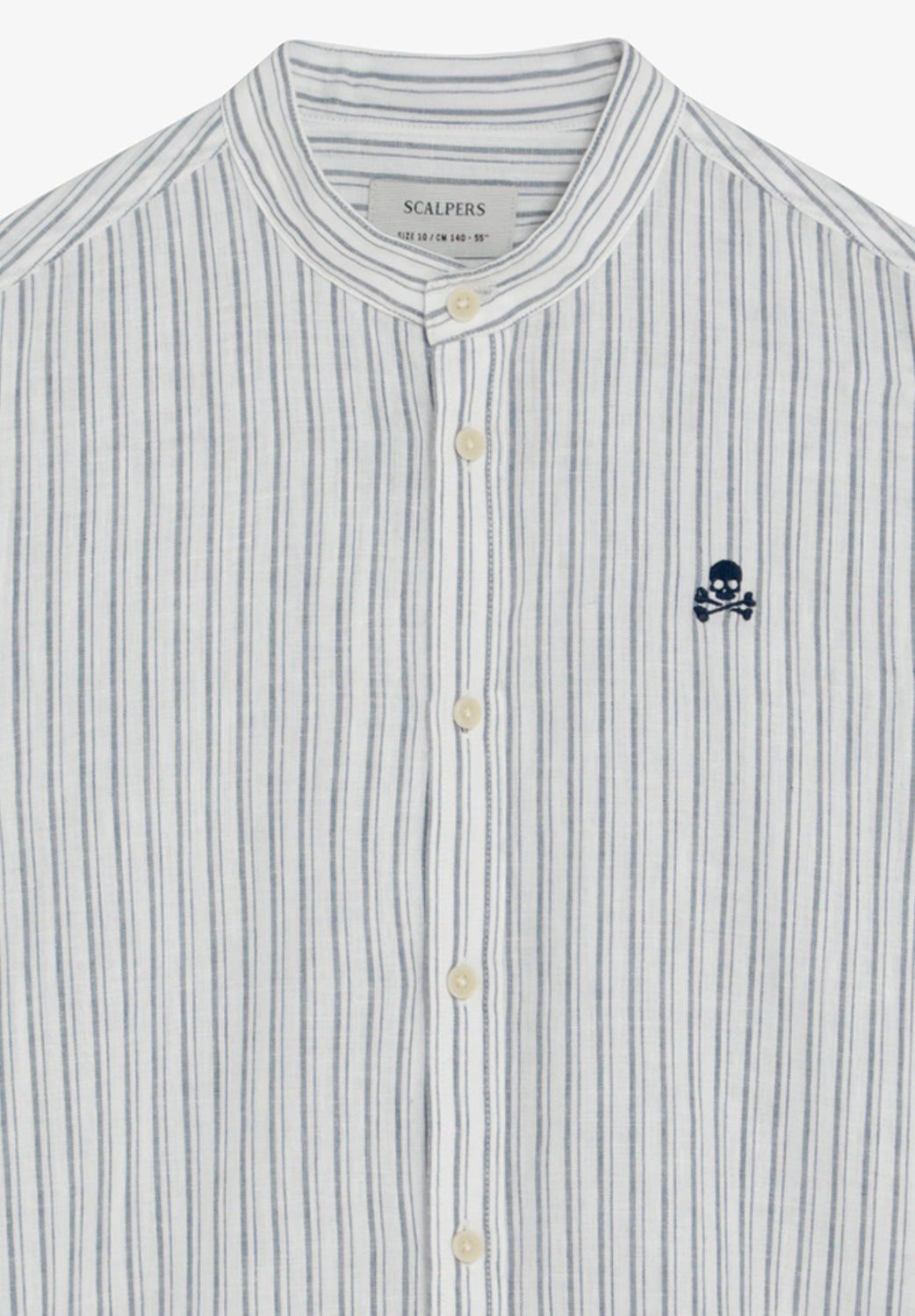 Camicia a righe realizzata in 100% cotone BCI. Colletto alla coreana e chiusura frontale con bottoni. Teschio ricamato sul petto. Polsini con bottoni e taglio regular fit.