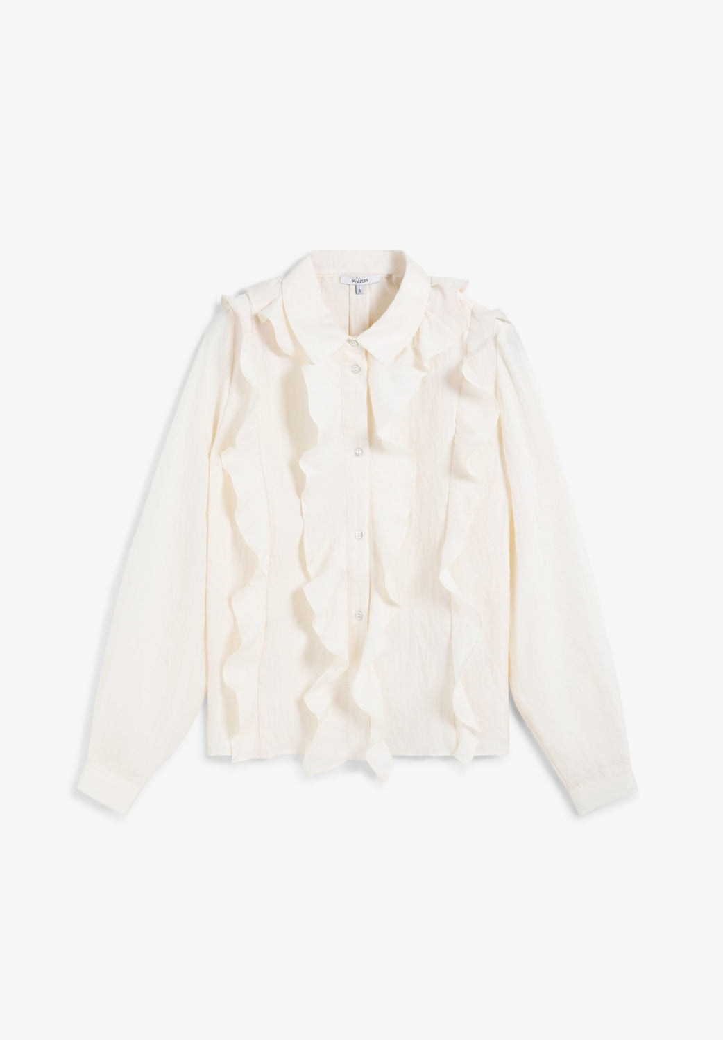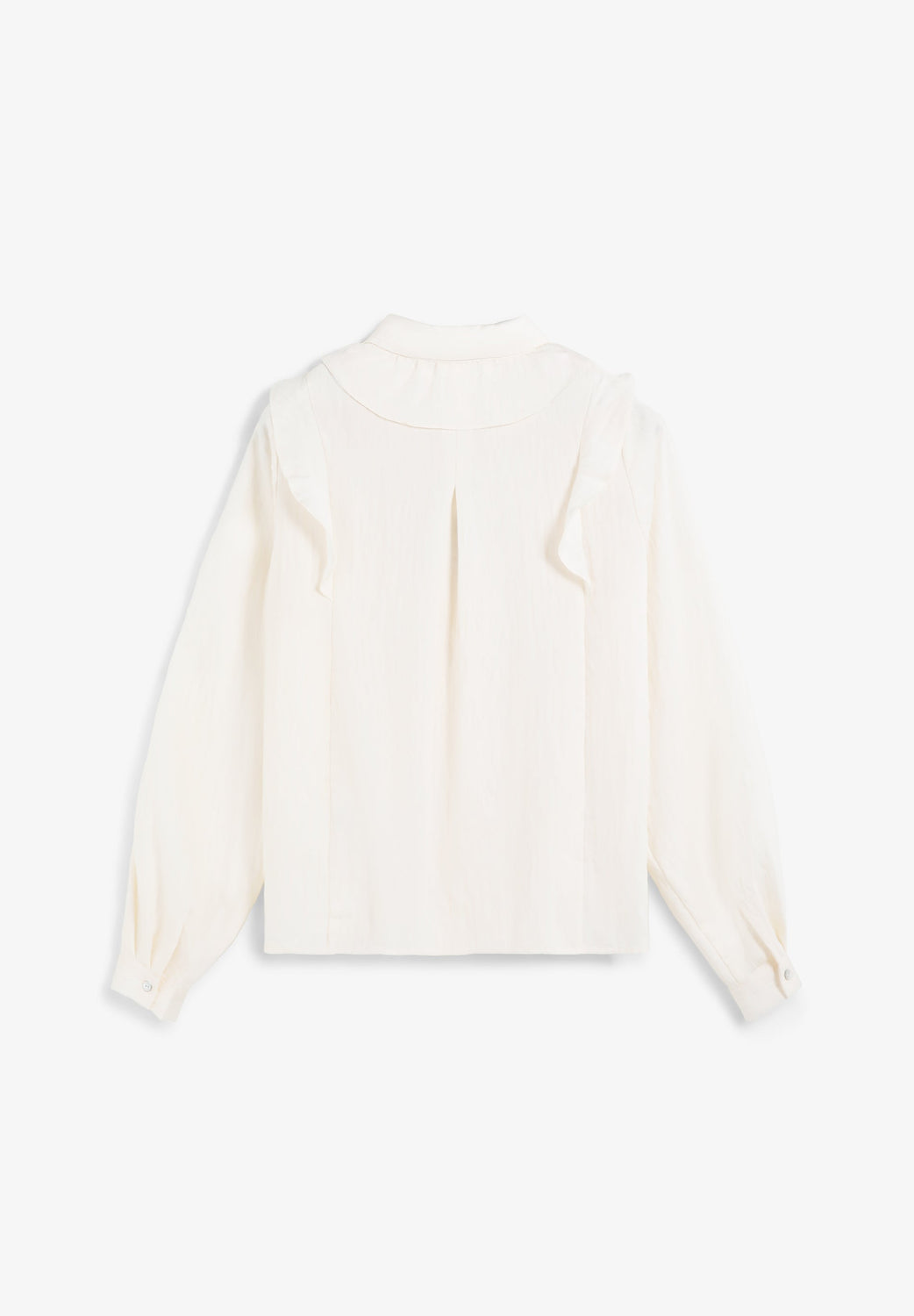 Blouse made of slightly stretchy cotton fabric. Regular fit, classic collar and long slightly puffed sleeves with buttoned cuffs. Ruffle detail at the front. Button fastening.