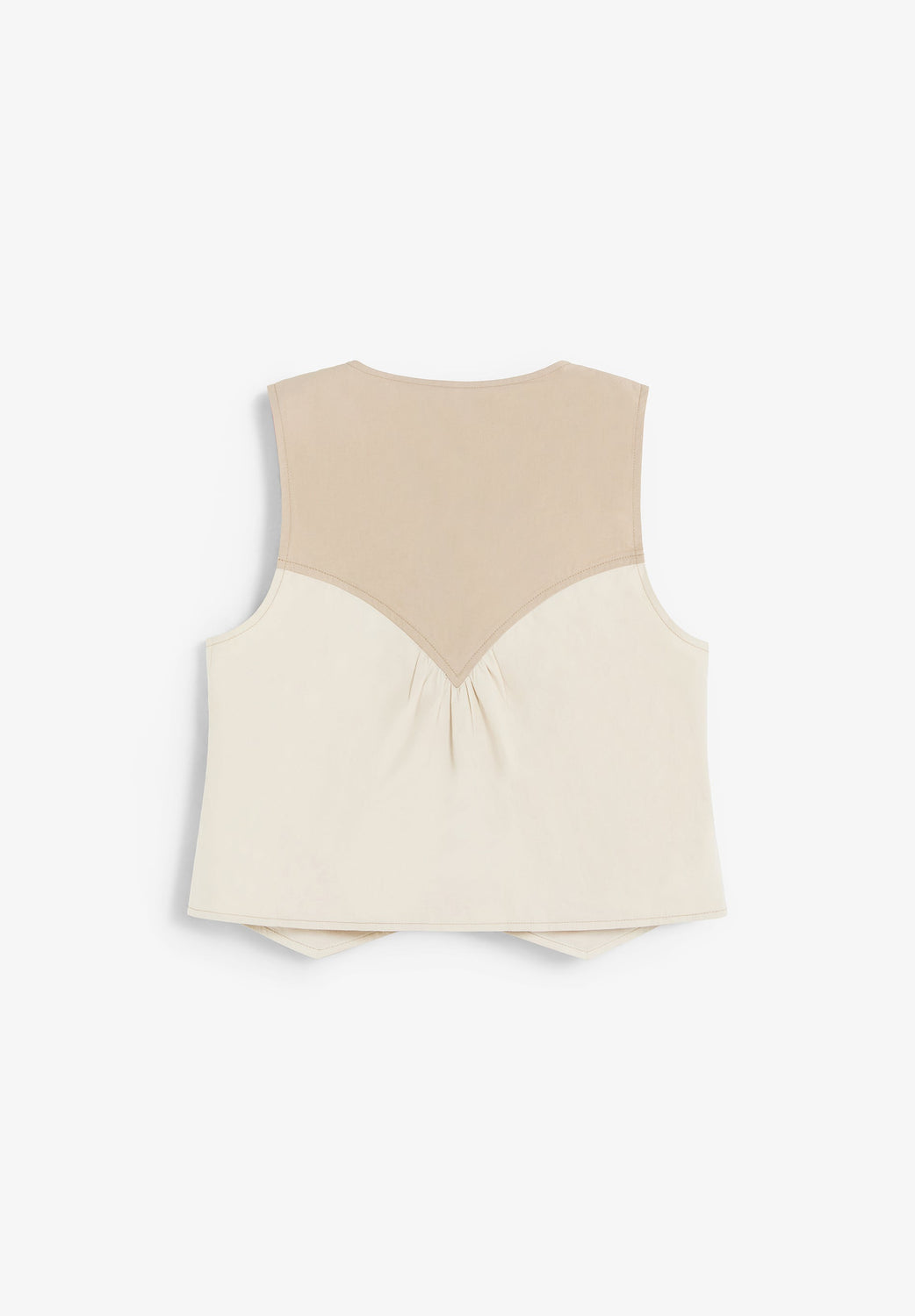 Gilet realizzato in 100% cotone. Regular fit. Dettaglio di tessuti sulla parte posteriore. Scollo a v e chiusura frontale con bottoni. Taglio crop.