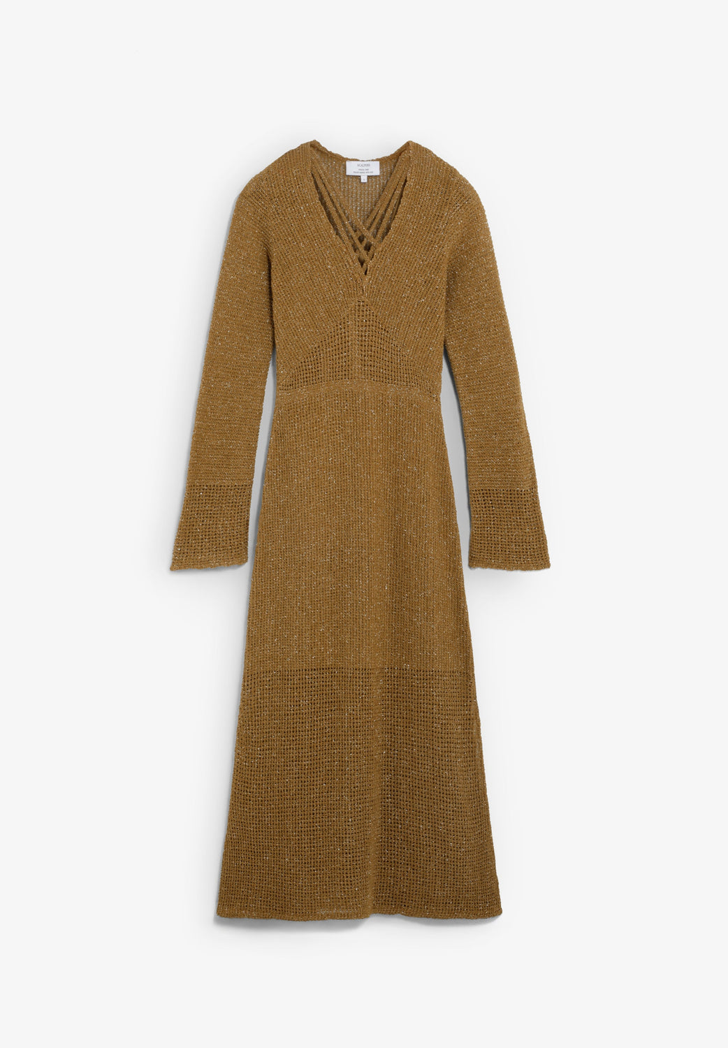 Vestito realizzato in maglia con filo lamè leggermente elastico. Taglio slim fit lungo, scollo a V e dettaglio incrociato. Maniche lunghe leggermente a campana. Dettaglio di pannello a contrasto in vita e sull'orlo.