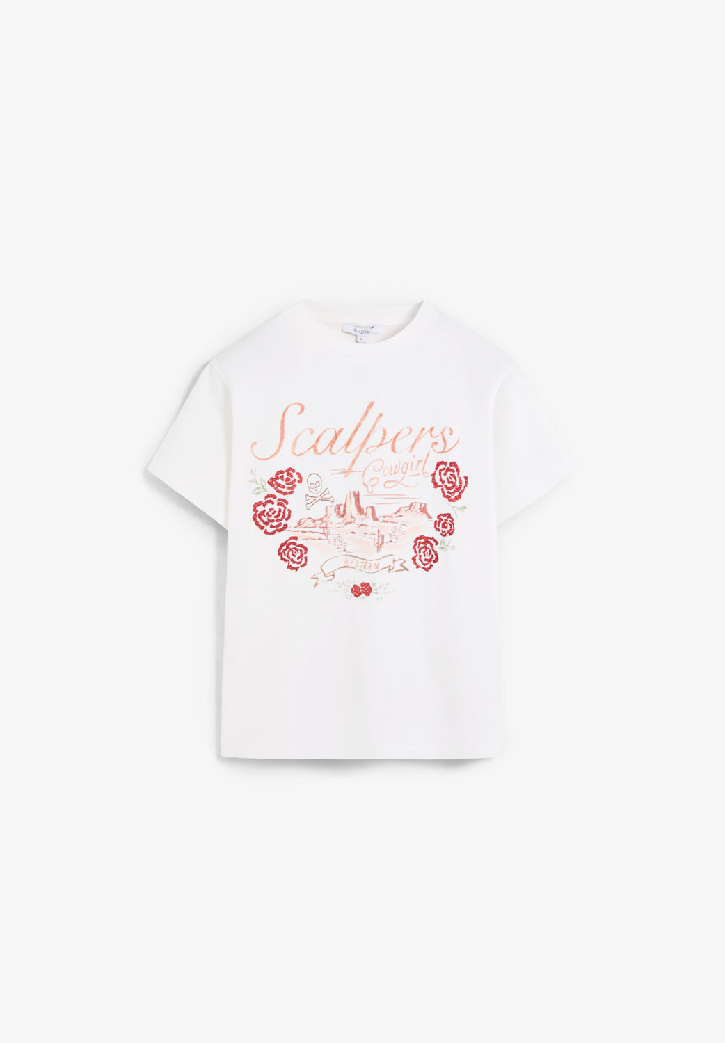 Maglietta realizzata in 100% cotone. Collo rotondo e maniche corte. Stampa anteriore con dettagli glitterati.