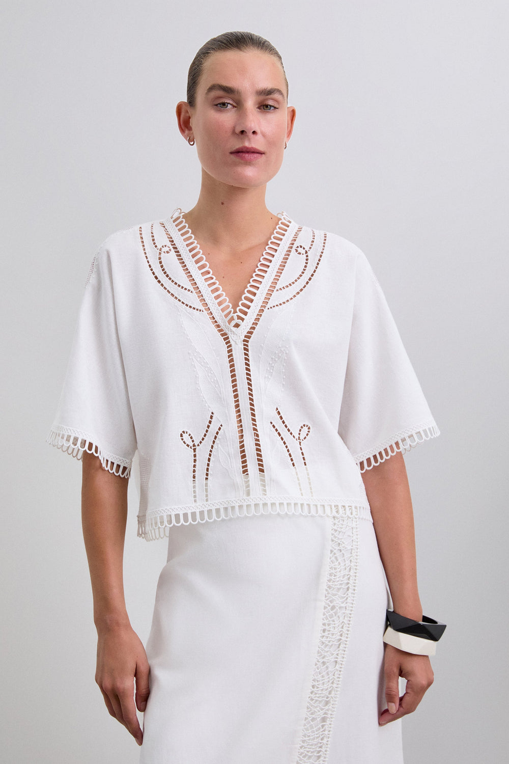Blouse van linnen- en katoenmix met kanten details. Lichtjes cropped model, V-hals en korte mouwen. Borduursel en afwerking op hals, mouwen en zoom. Striksluiting en opening aan de achterkant.