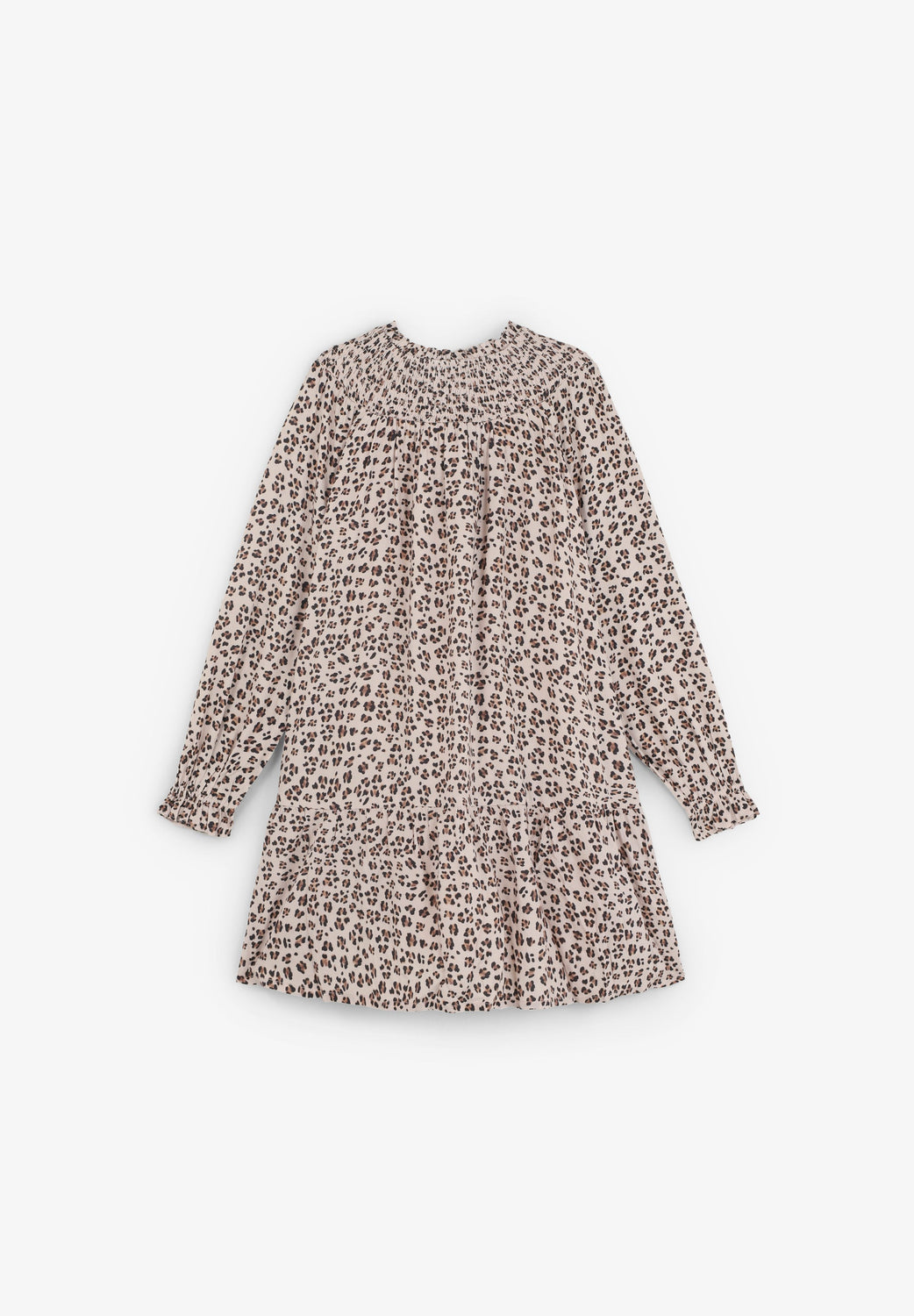 Jurk met dierenprint. Licht poffende lange mouw. Honingraatkraag en knoopsluiting.