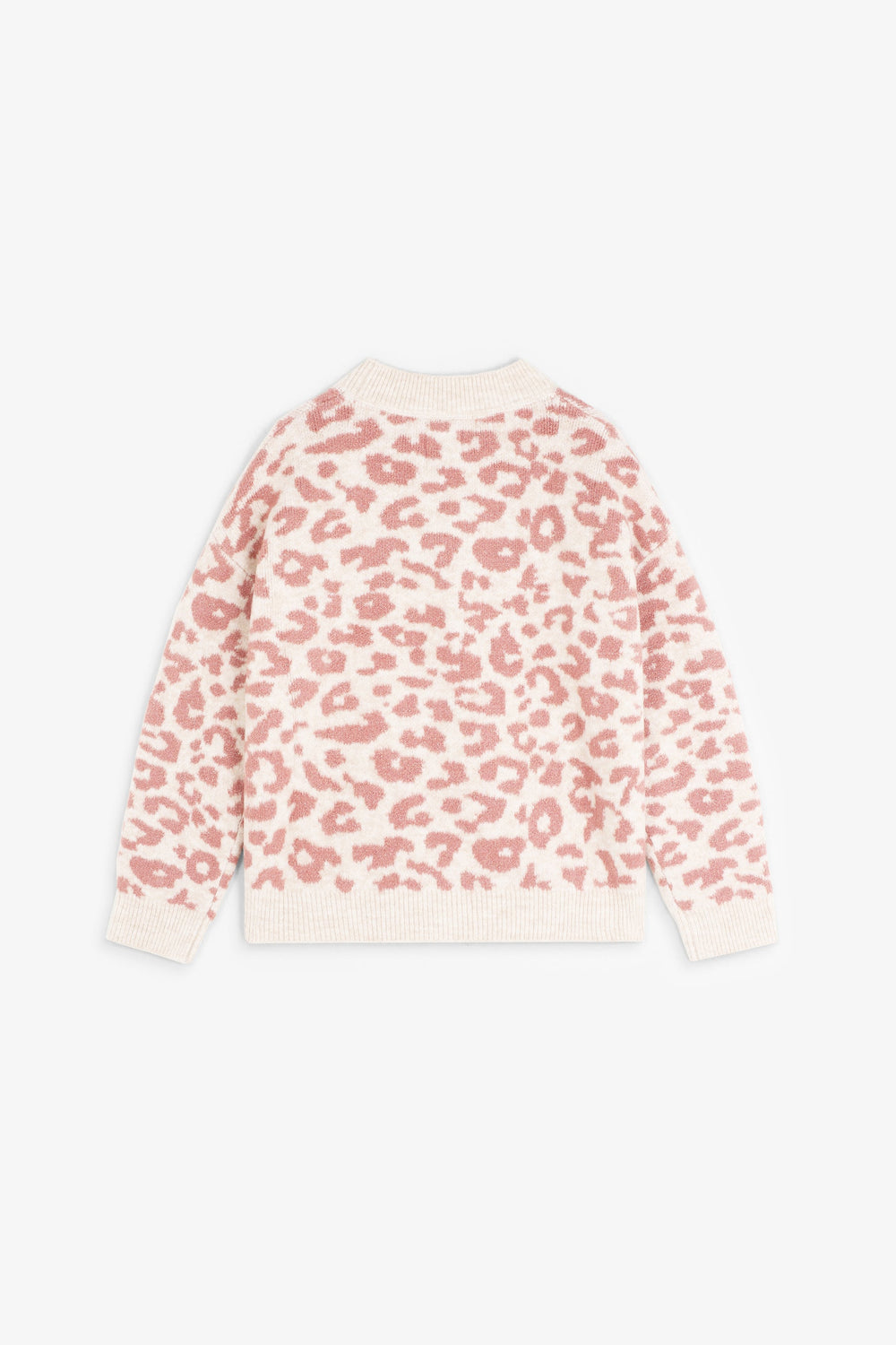 Gebreide trui. Lange mouw. Ronde hals. Dierenprint. Contrasterende ribboorden.
