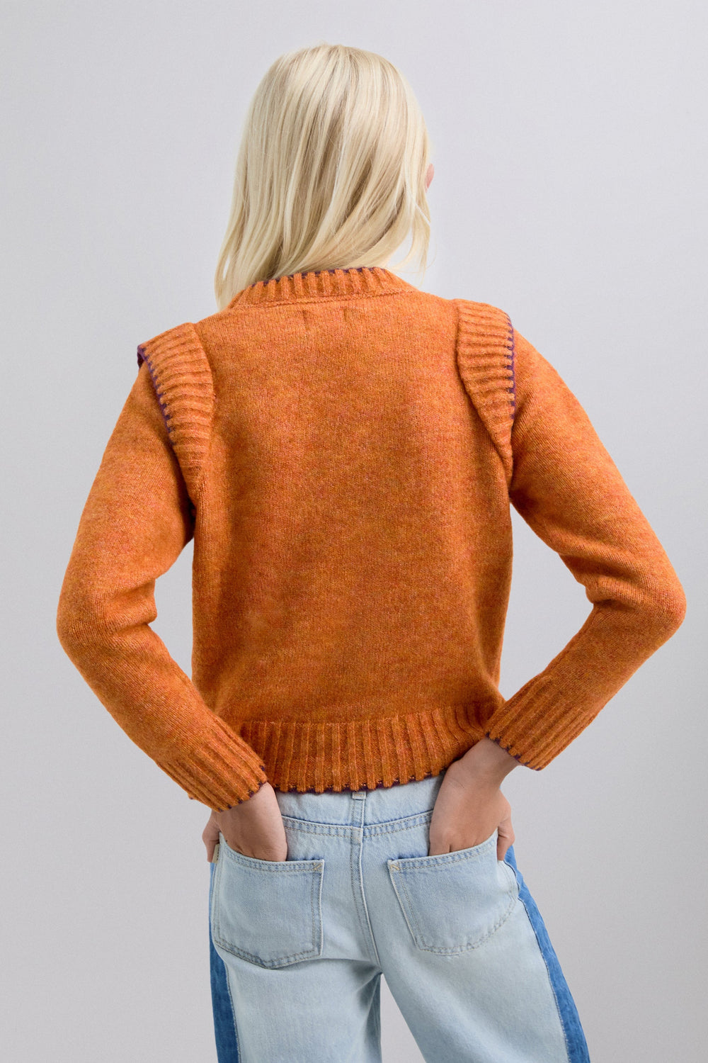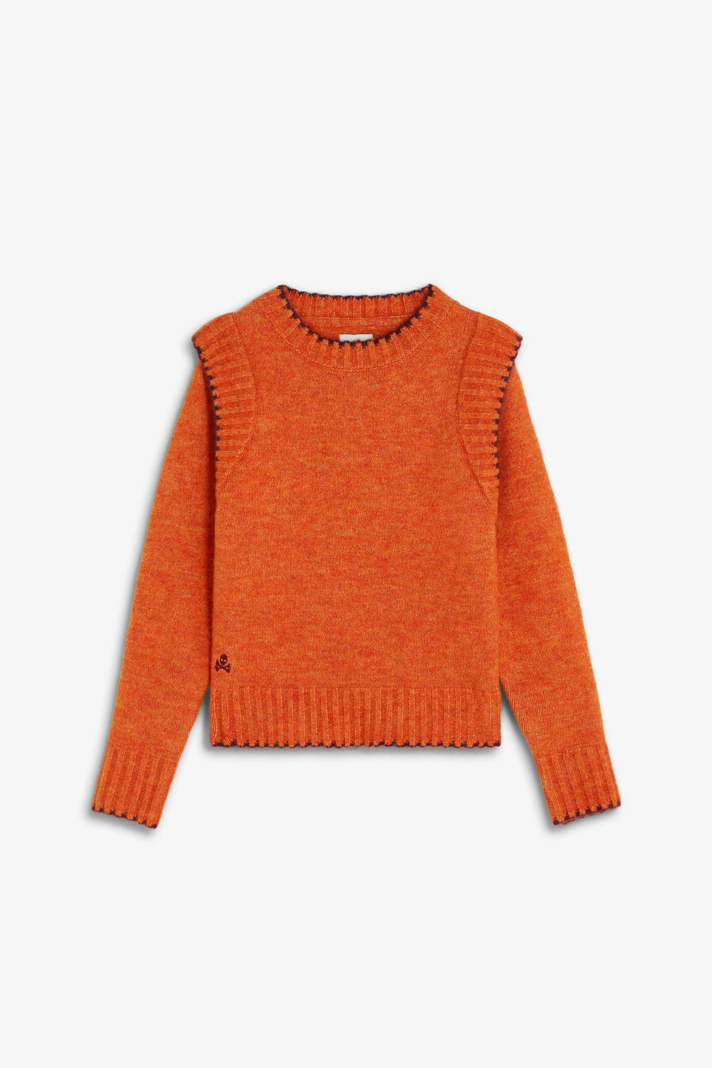 Gebreide trui. Ronde hals. Lange mouw. Geborduurde contrasterende doodskop. Ribboorden