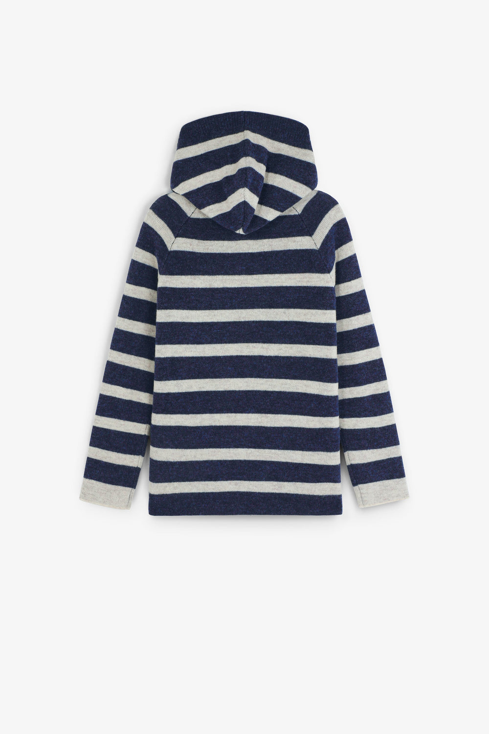 Tricot trui met capuchon. Gestreepte print. Lange mouw. Geborduurd contrasterend doodshoofd op de taille.