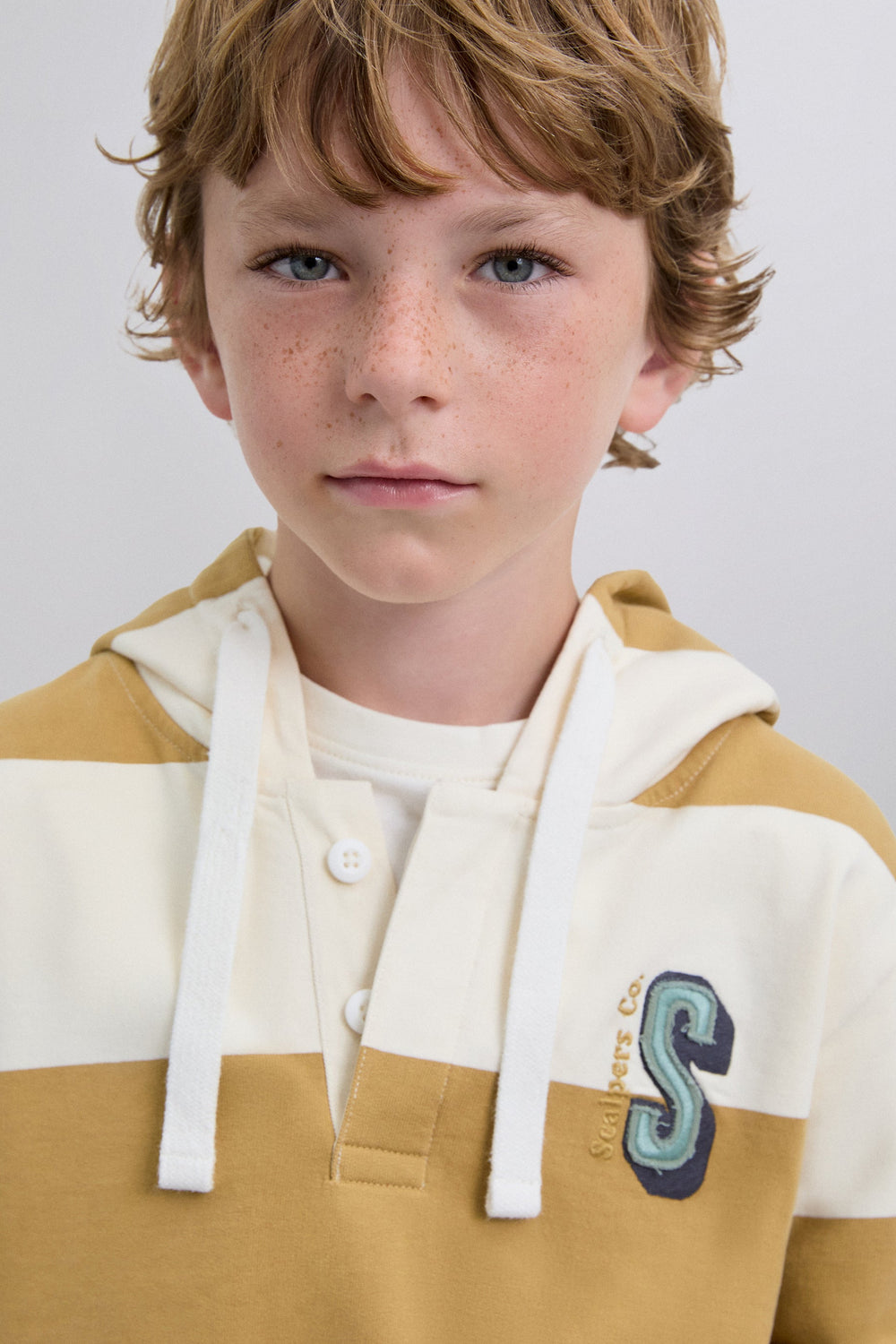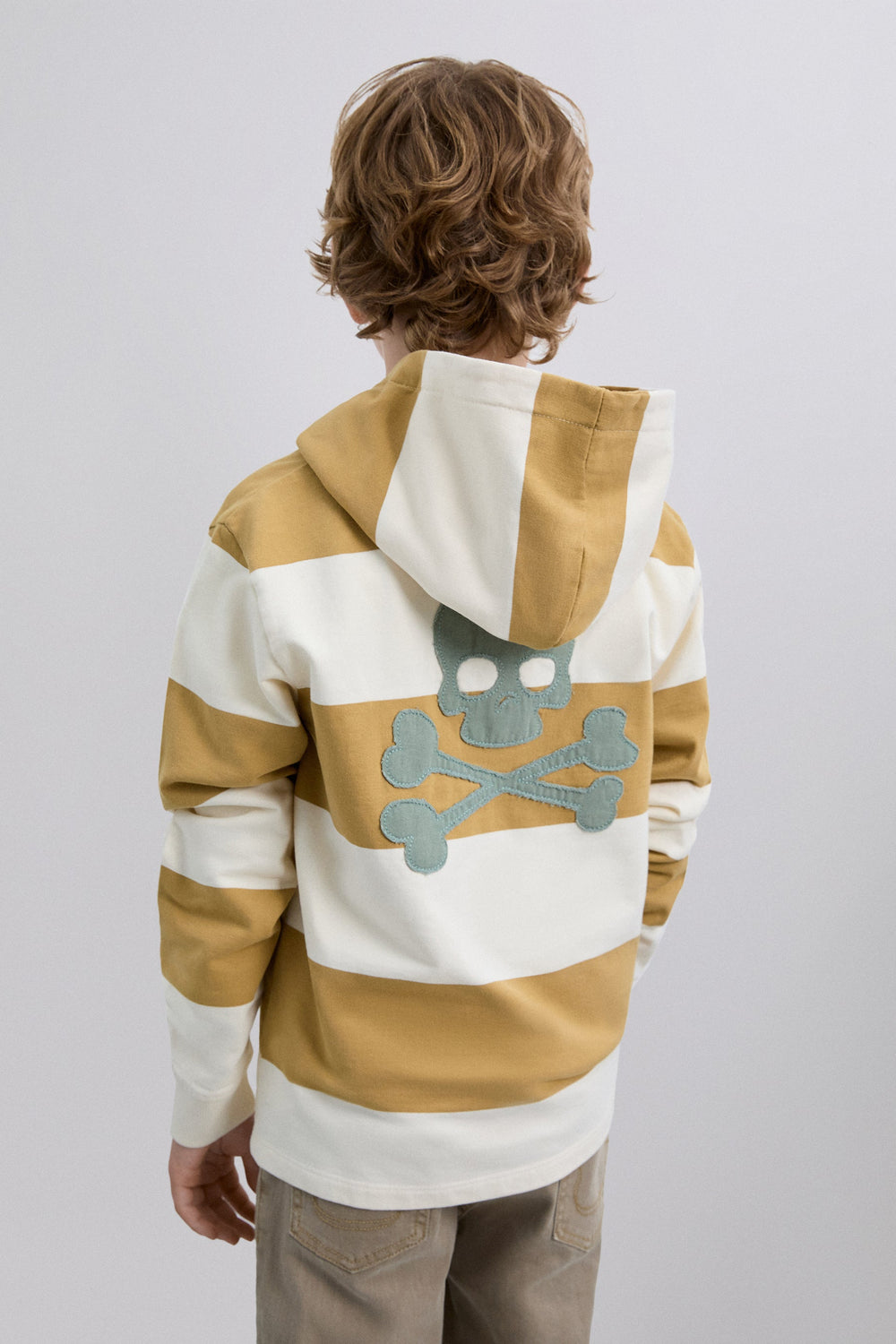 Sweater met verstelbare capuchon met trekkoord van 100% BCI-katoen. Gestreepte print. Geborduurd motief op de borst en doodshoofd op de rug. Opening met knoop aan de voorkant.