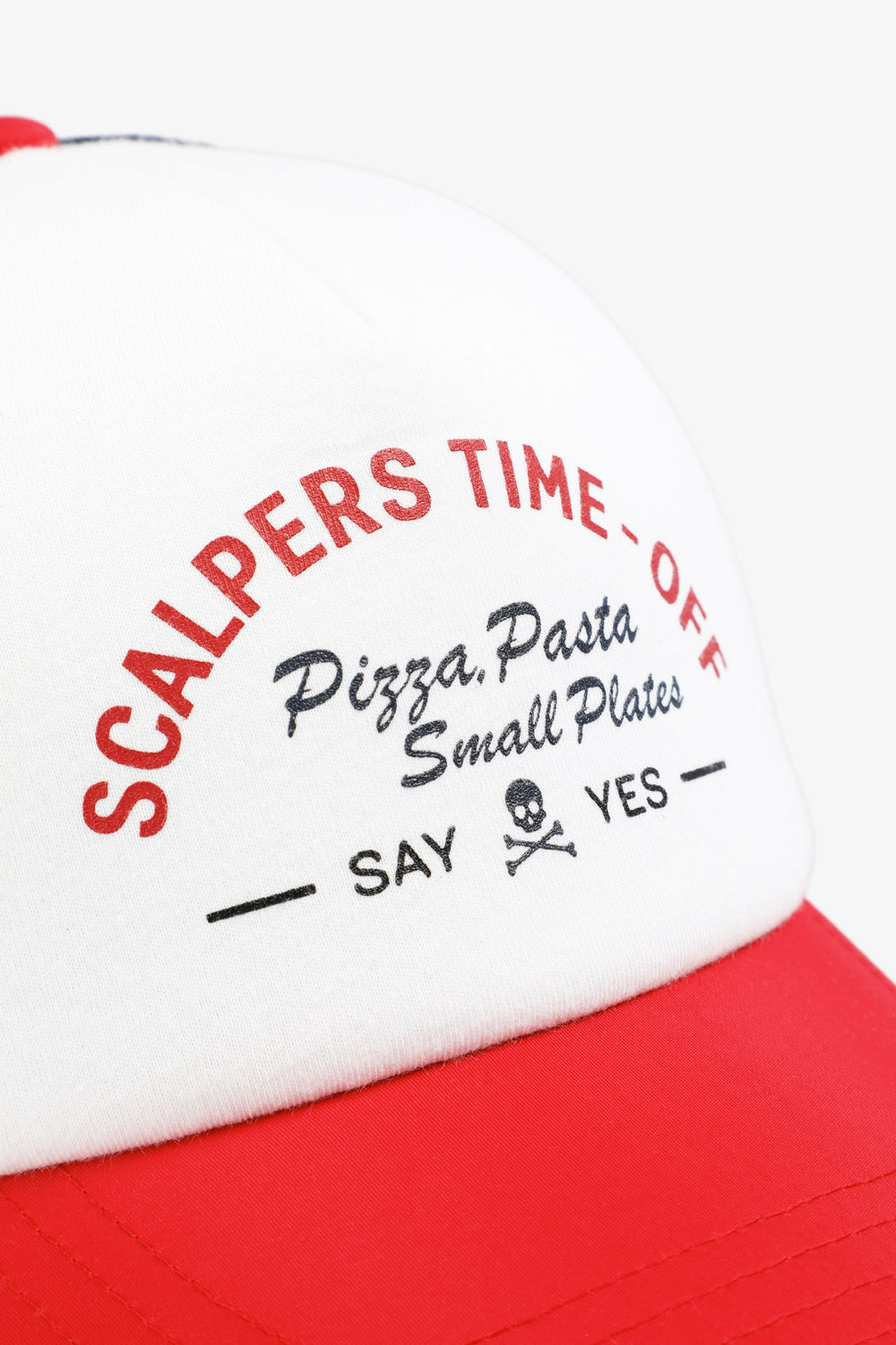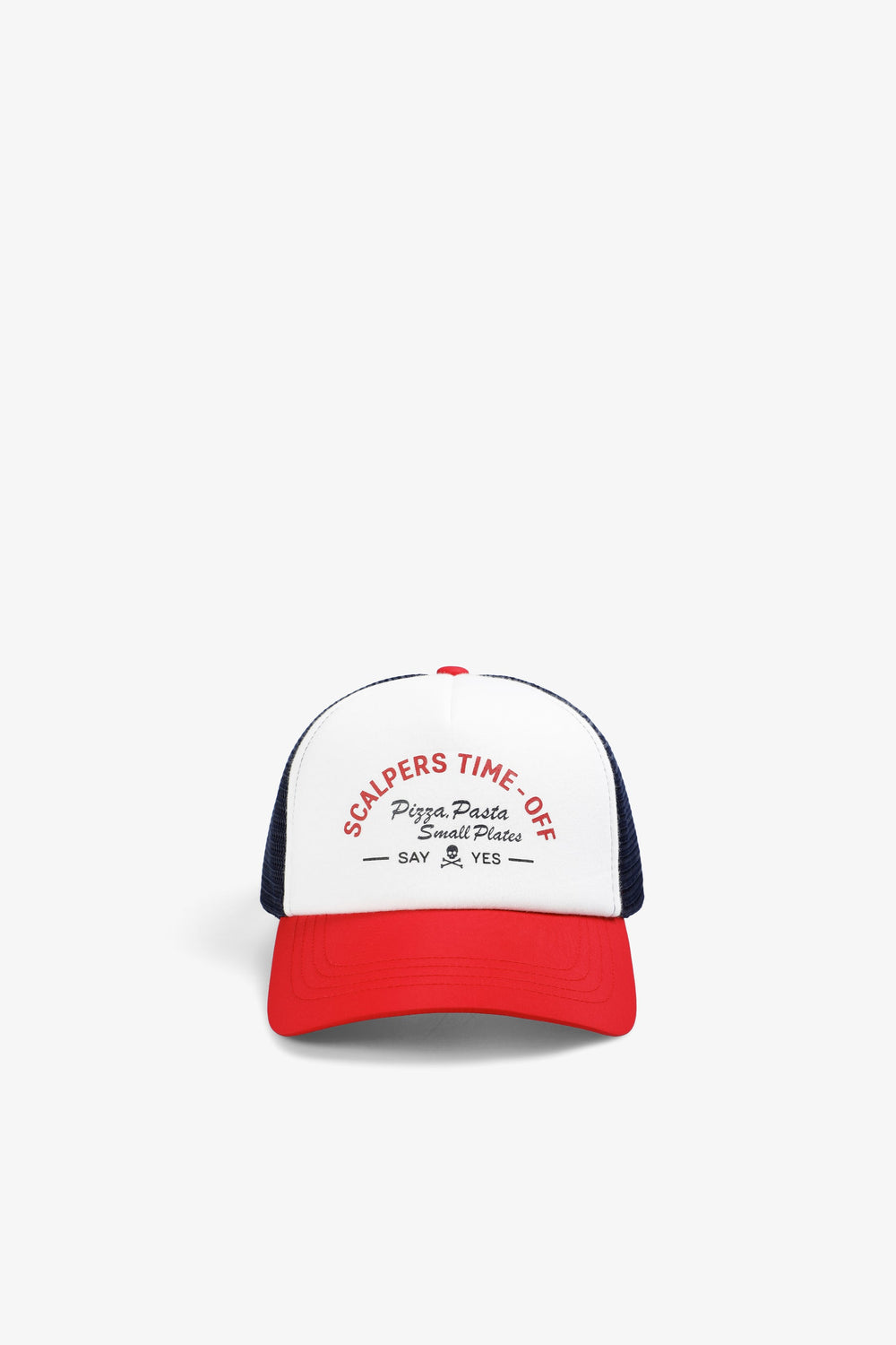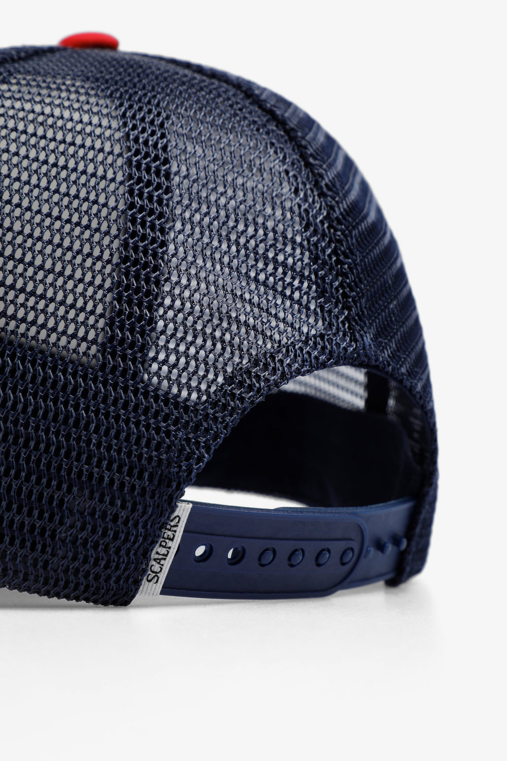 Trucker-stijl pet van katoenmix en technische stof met achterkant van gaas. Contrasterende klep en logoprint op de voorkant.