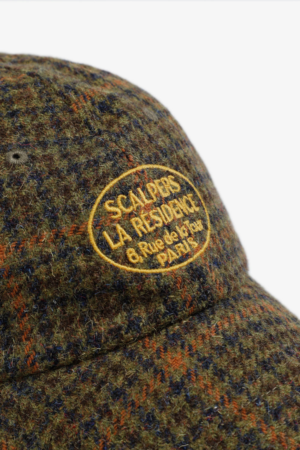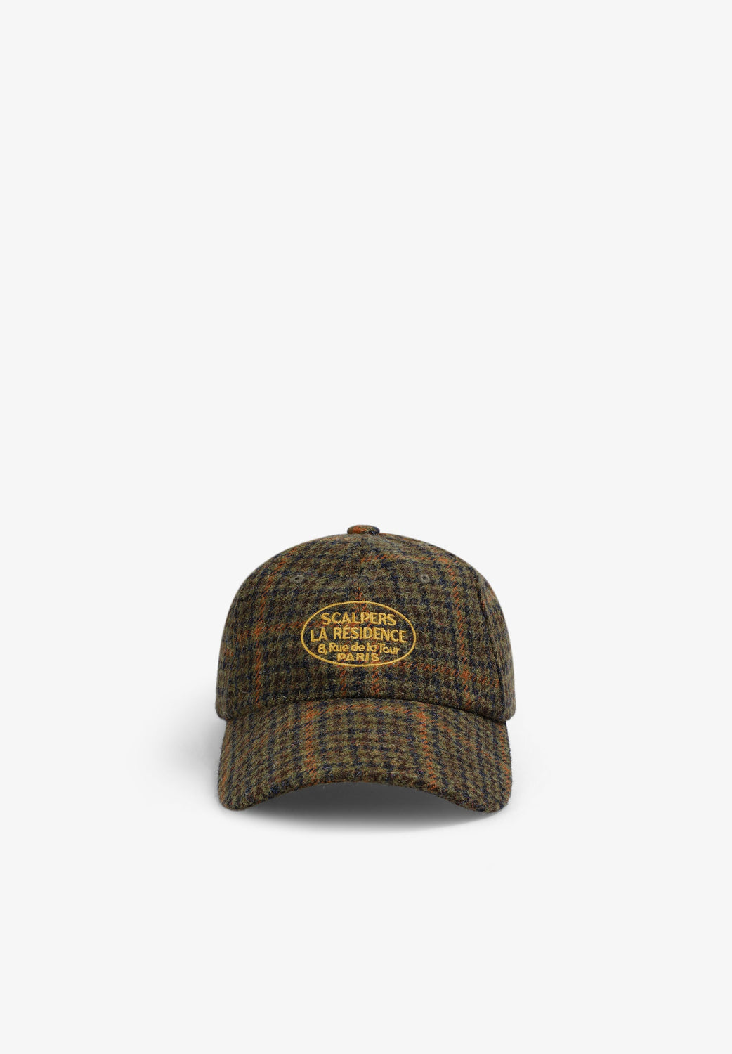 Pet van wol. Schotse ruit. Borduursel op de voorkant. Verstelbare sluiting.