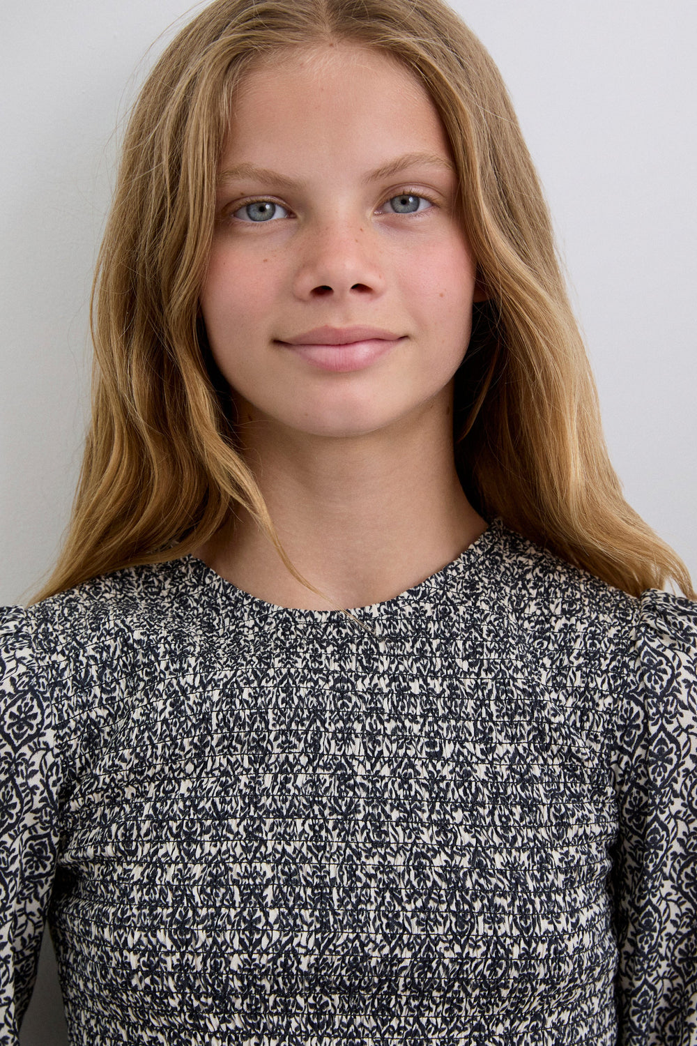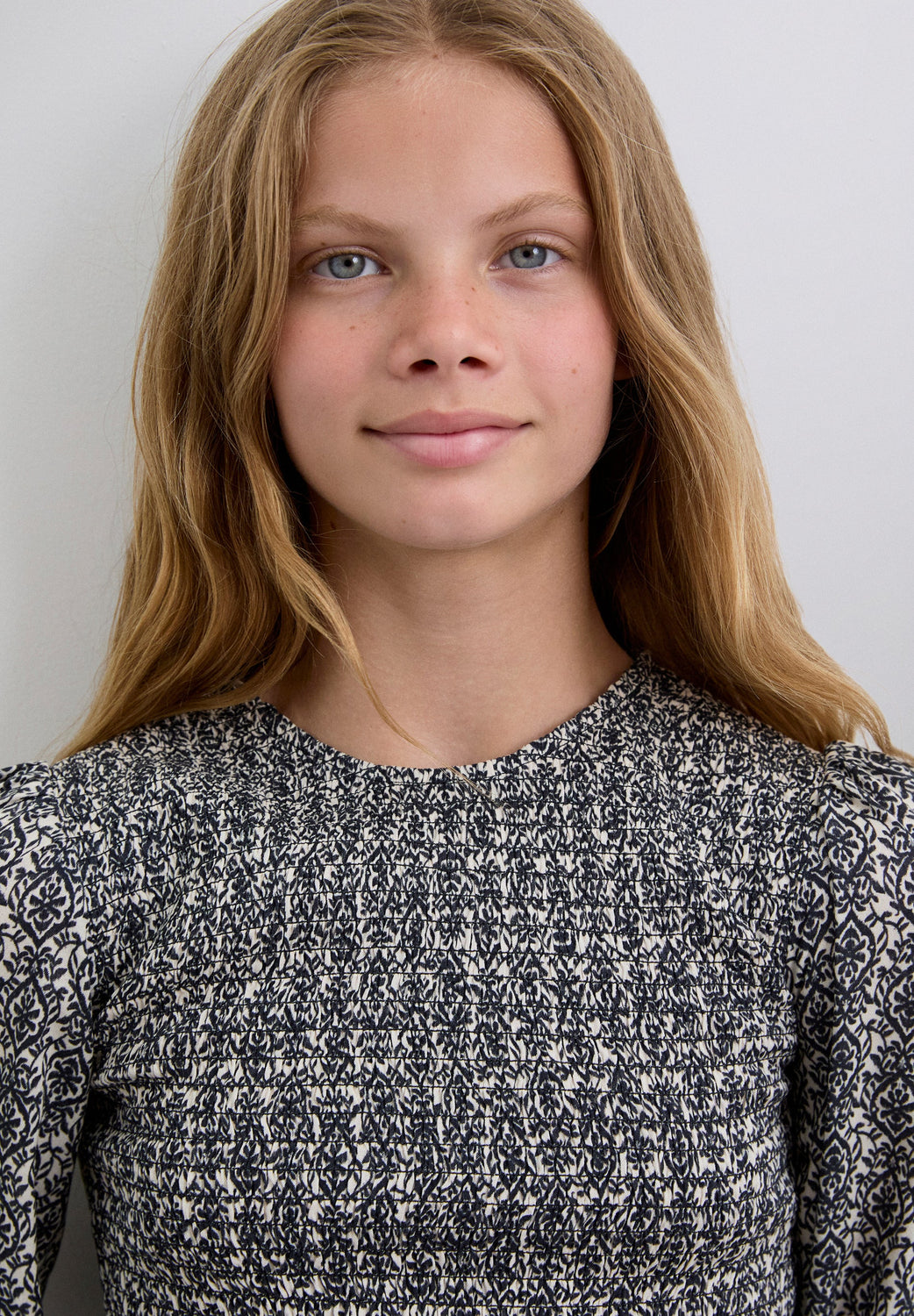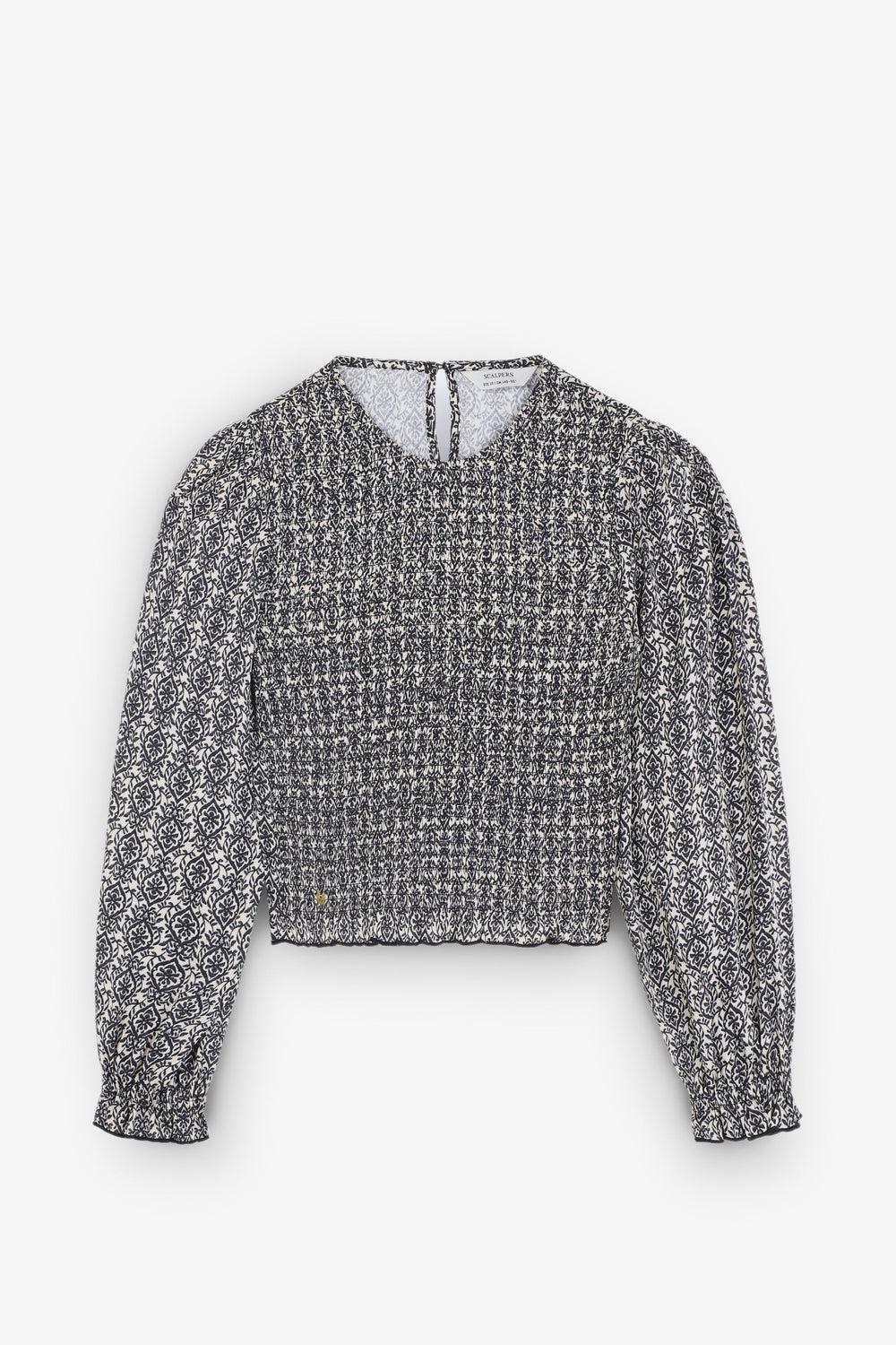 Blouse van 100% viscose met honingraatmotief. Regular fit, ronde hals en knoopsluiting achter. Lange ballonmouw met elastische manchet en volant op de zoom.