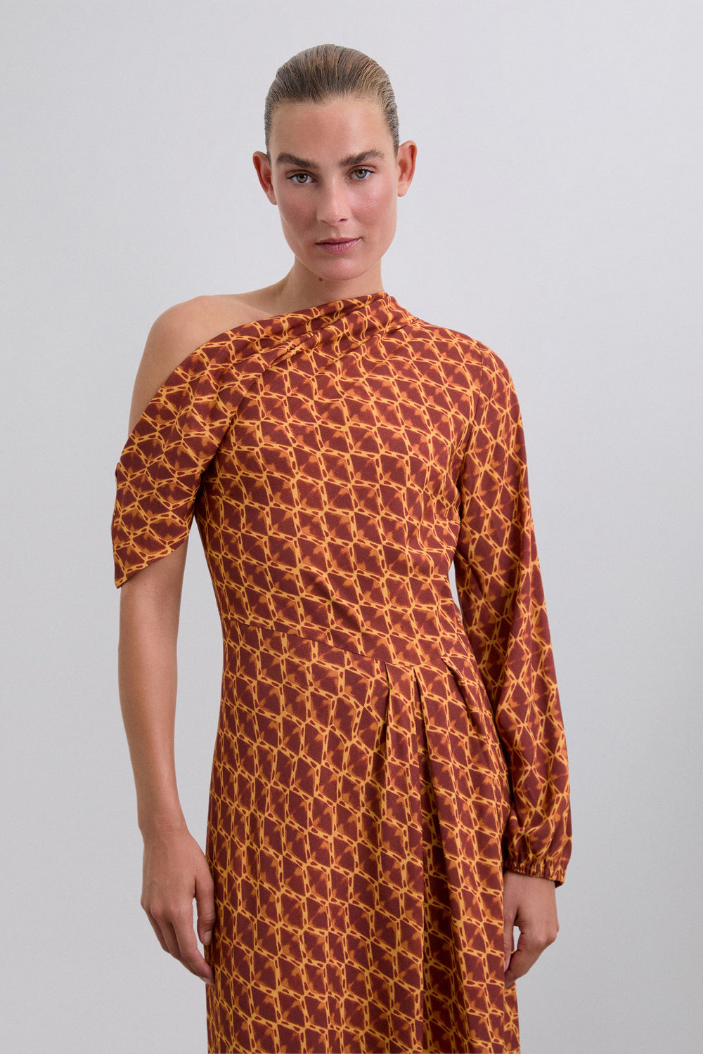 Jurk met print en lange en korte pofmouwen met elastische boorden. Asymmetrische hals. Eén blote schouder. Slim fit.
