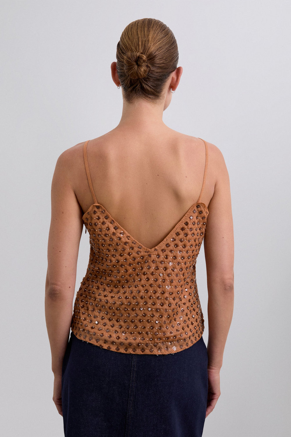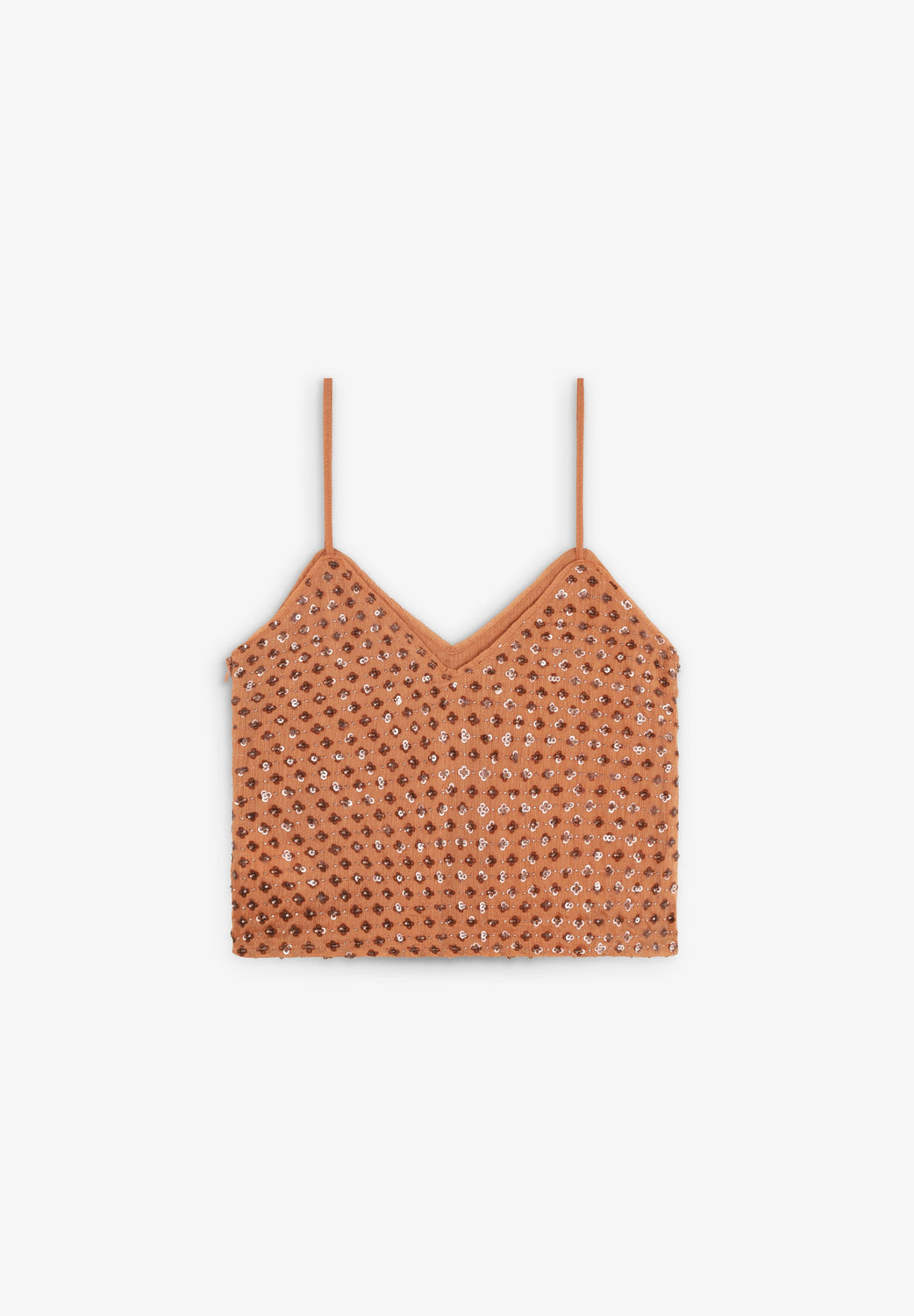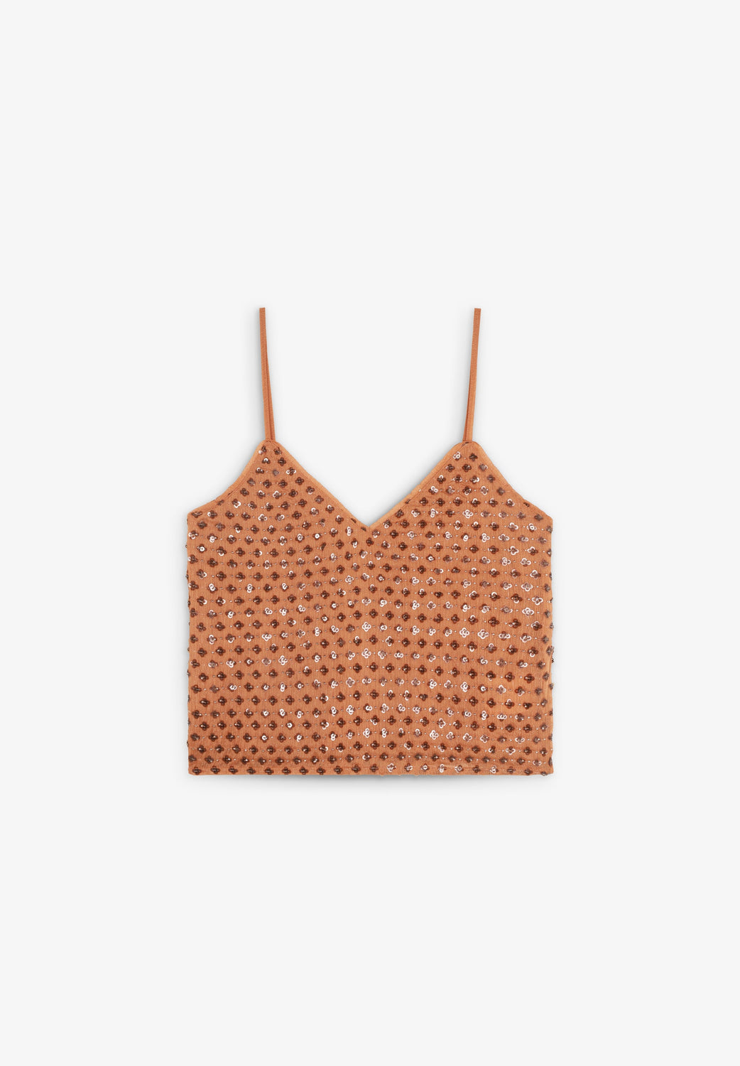 Top met V-hals en dunne bandjes. Pailletten applicatie. Ritssluiting aan de zijkant.