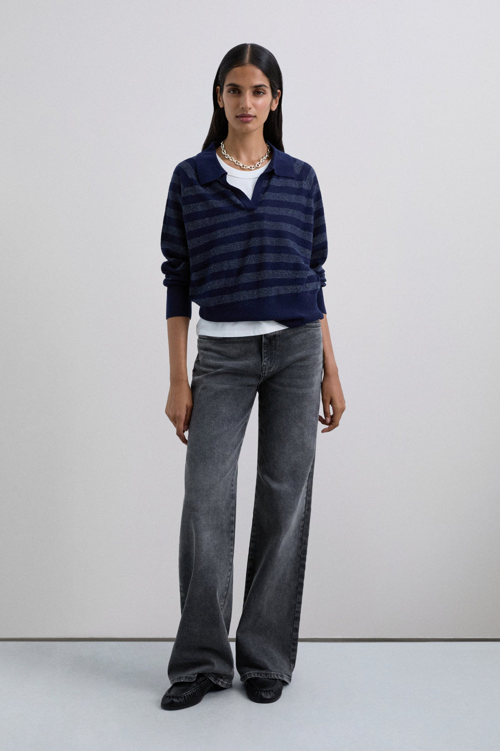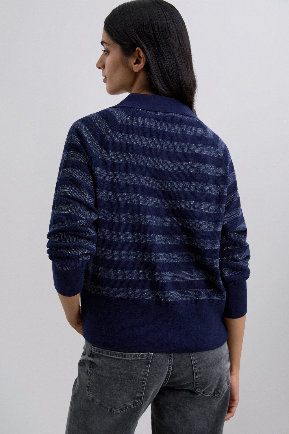 Trui type polo gemaakt van wolmix. Regular fit. Gestreepte print met metallic draad. Polokraag. Lange mouw met geribde boord.