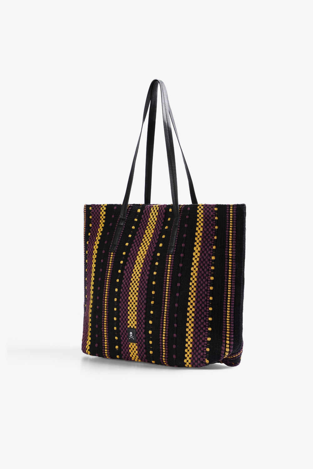 Shopper van 100% biologisch katoen met etnische print. Voering met zakje. Magnetische knoopsluiting en logopatchdetail op de voorkant.