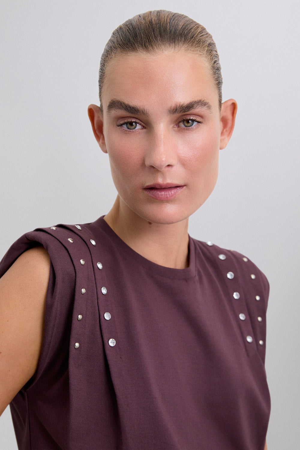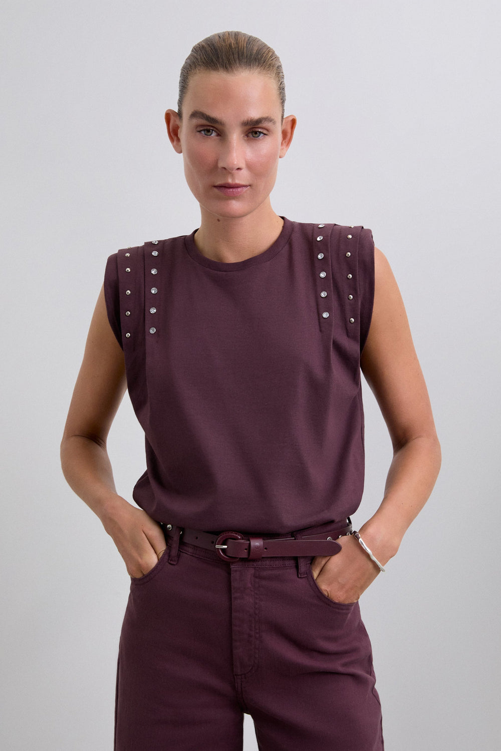 T-shirt gemaakt van 100% BCI-katoen. Regular fit. Ronde hals en mouwloos. Studs op de schouder.