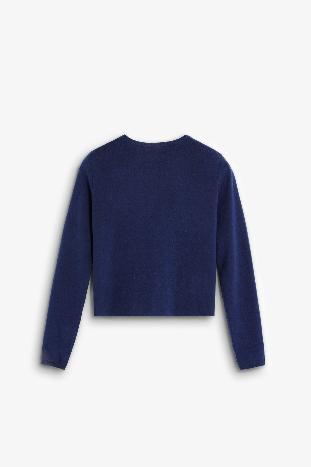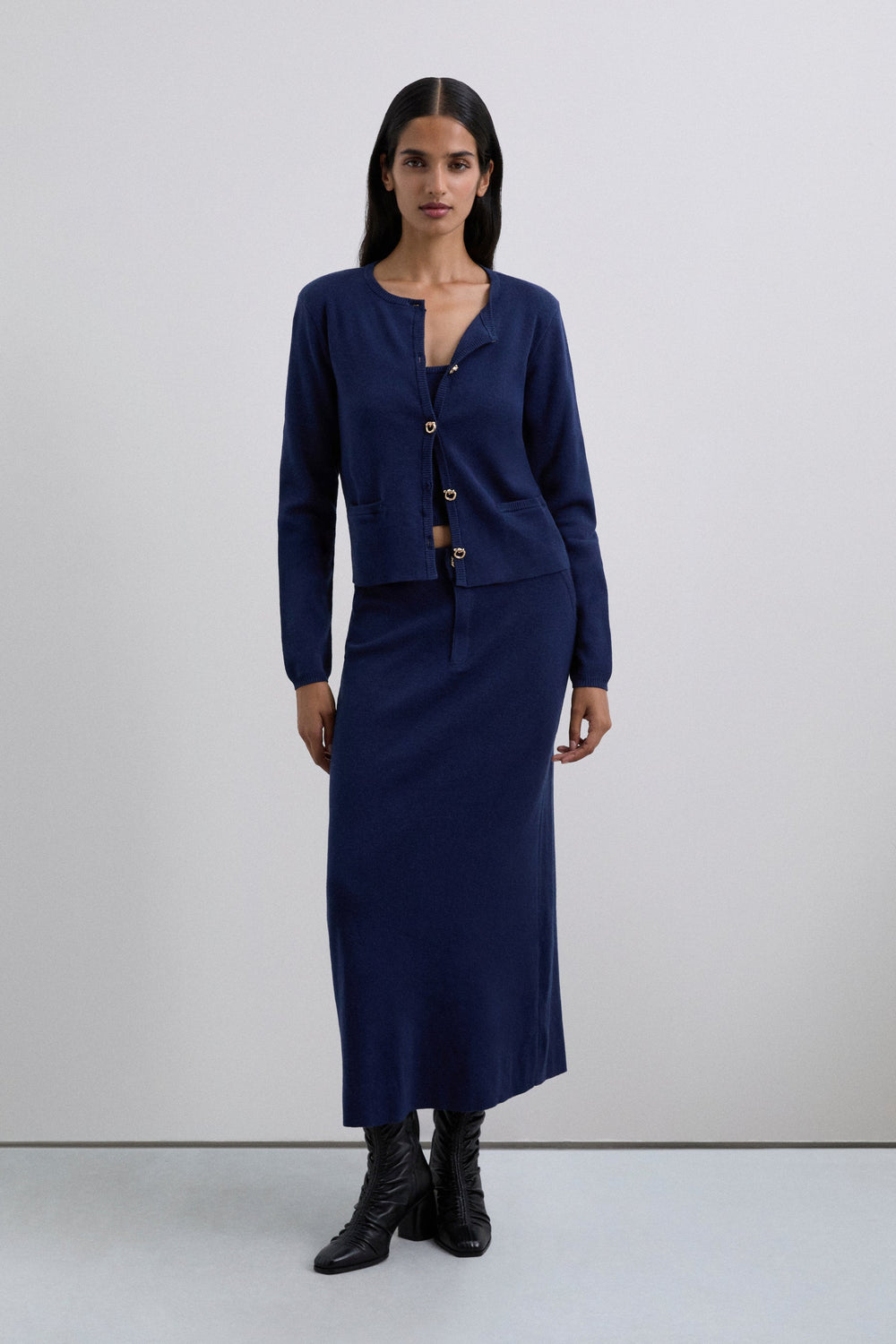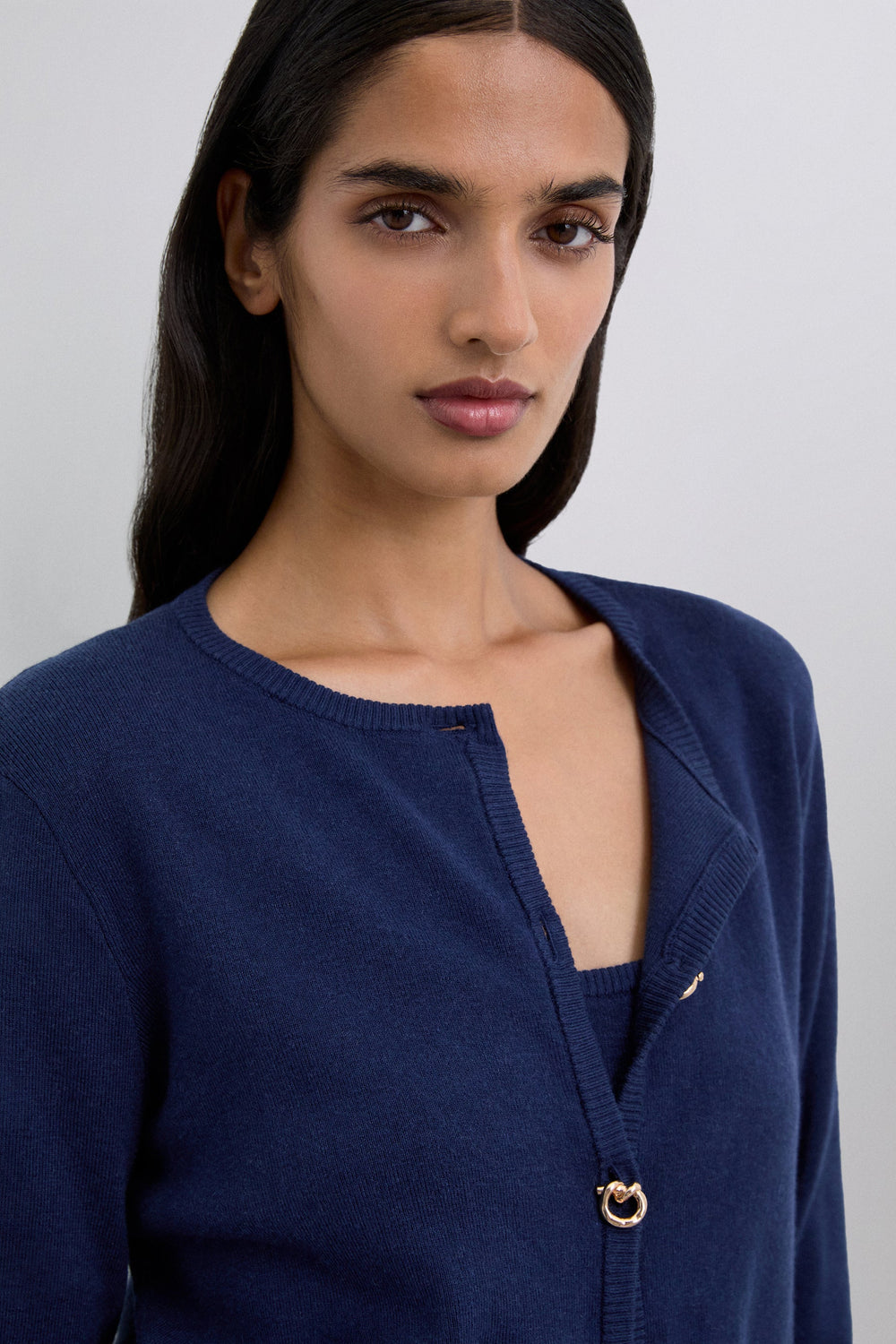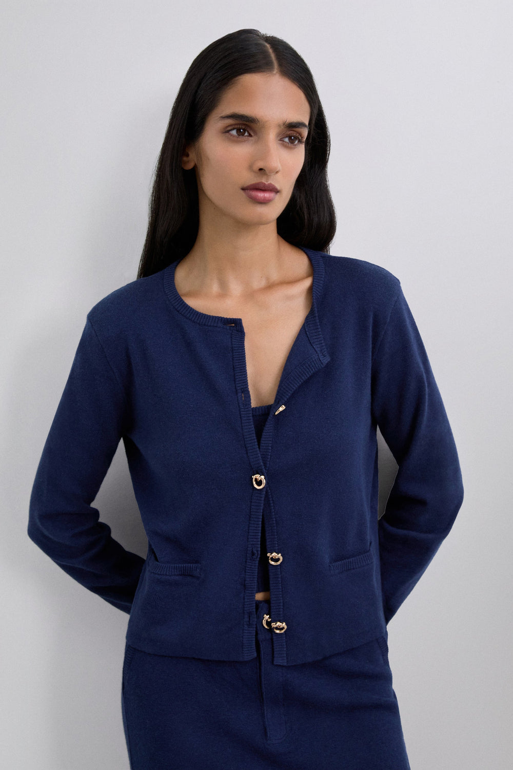Fijne tricot vest gemaakt van een mix van katoen en viscose. Slim fit. Ronde hals. Lichte schoudervulling. Lange mouw. Paspelzakken aan de voorkant. Knoopsluiting met gouden knoopdetail.