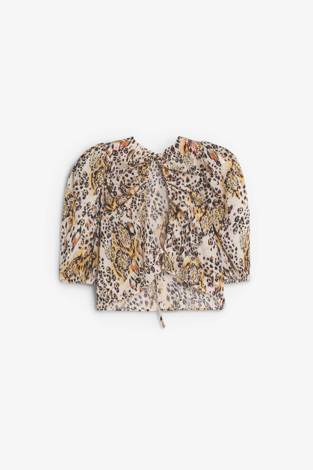 Top met dierenprint. Ronde hals en korte brede mouw. Rug met striksluiting.