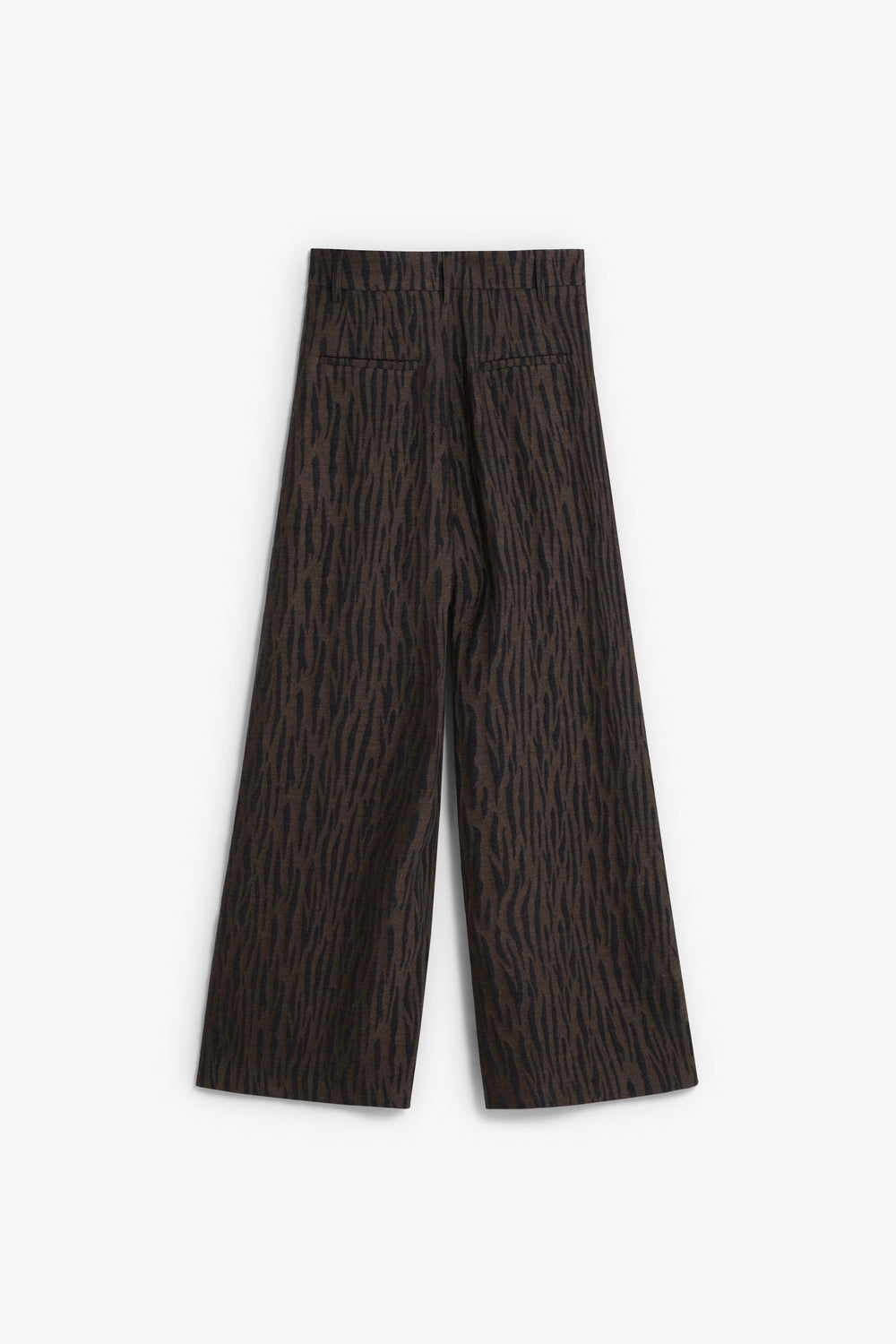 Broek met ritssluiting verborgen door een overslag, met haak en knoop. Twee zijzakken. Dubbele bandplooi op de voorkant. Jacquardstof met dierenprint.