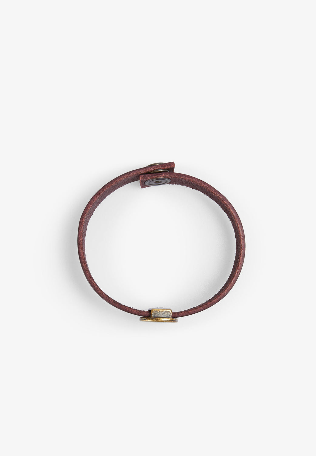 Armband gemaakt van 100% leer. Metallic applicatie met doodshoofd. Drukknoopsluiting.