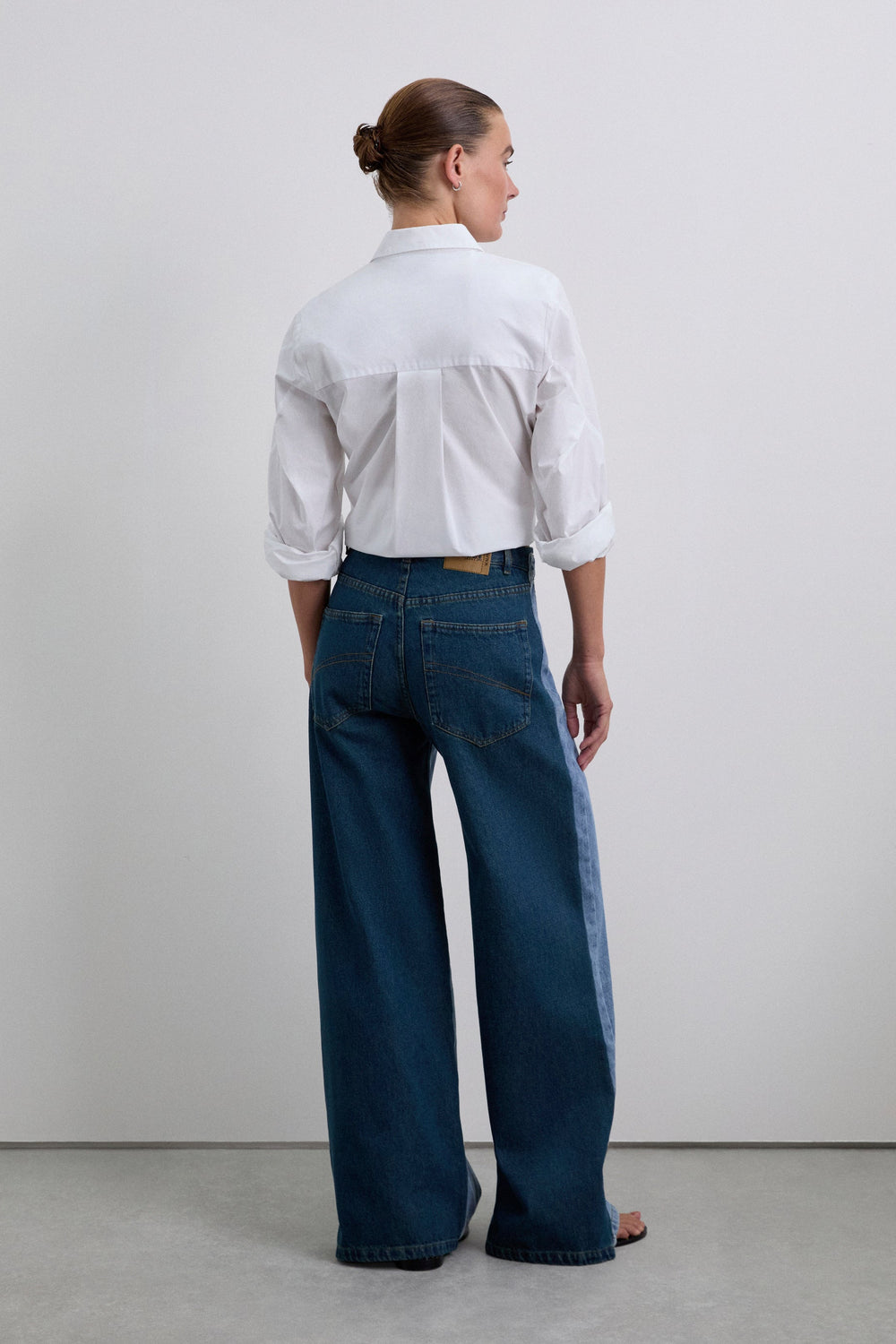 Pantalón denim confeccionado en algodón 100%. corte regular fit, bicolor, cierre con cremallera y botón, trabillas en cintura, cinco bolsillos.