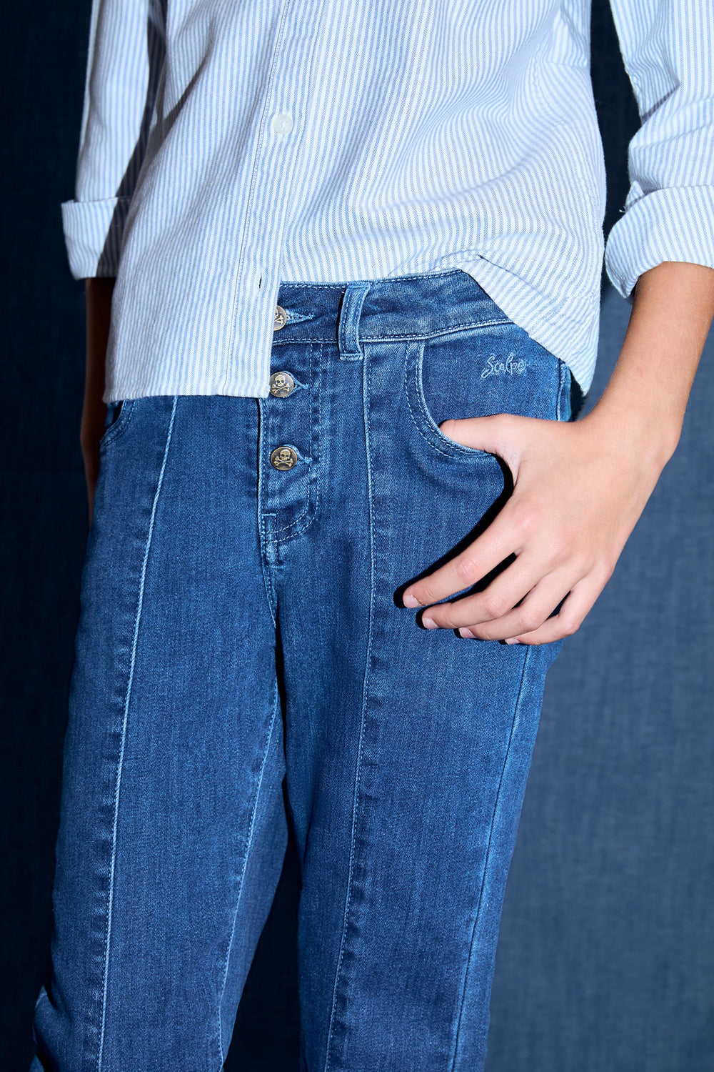 Trousers made of slightly stretchy cotton. Flared. Button fastening with skull logo details. Front pockets and back patch pockets Finished with fringing and front stitching.