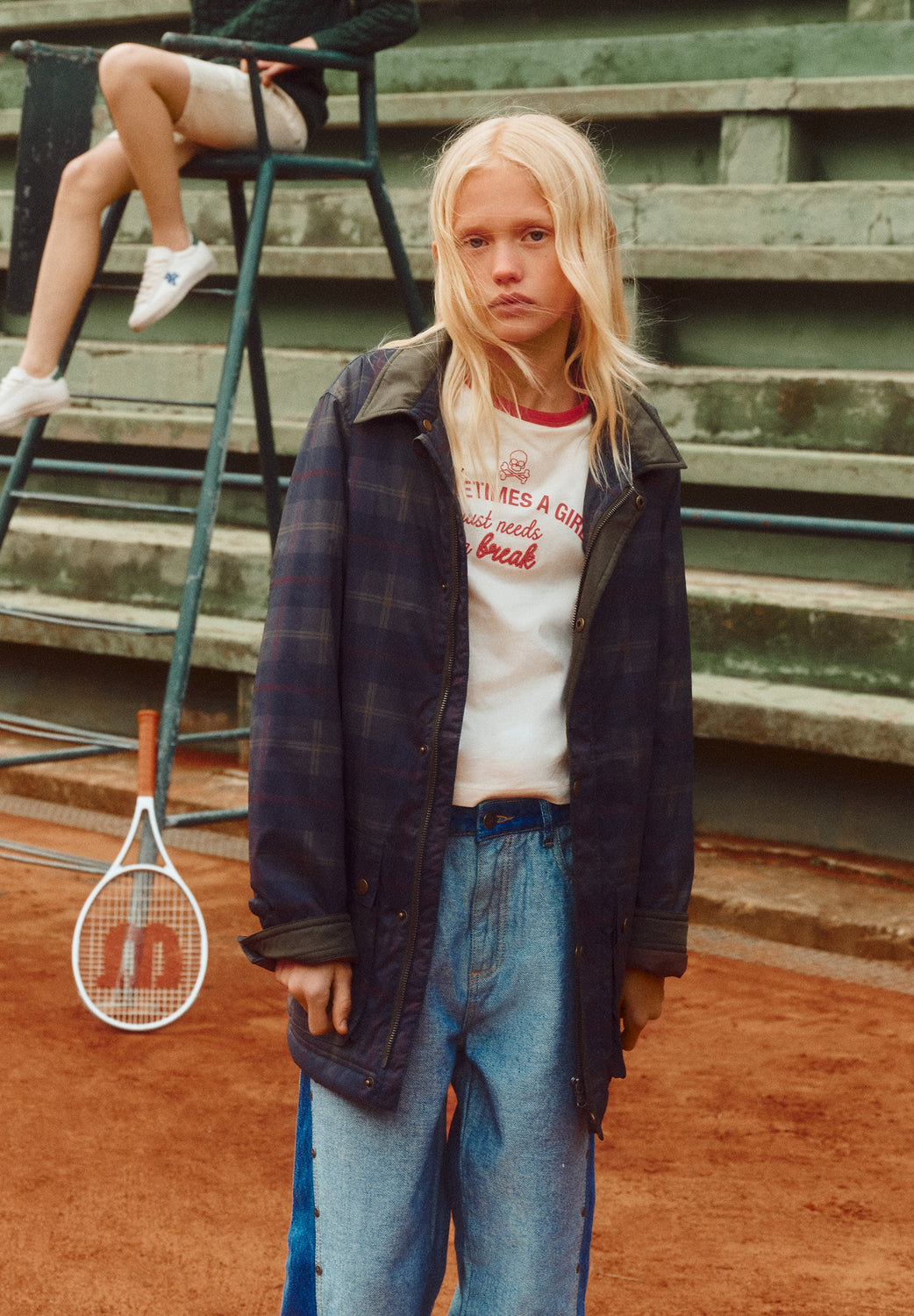 Geruit jack met contrasterende kraag. Blinde hoofdritssluiting met gepersonaliseerde trekker en knoopsluiting. Twee steekzakken met drukknoopsluiting. Manchetten met een puntige sluiting en drukknoopjes.