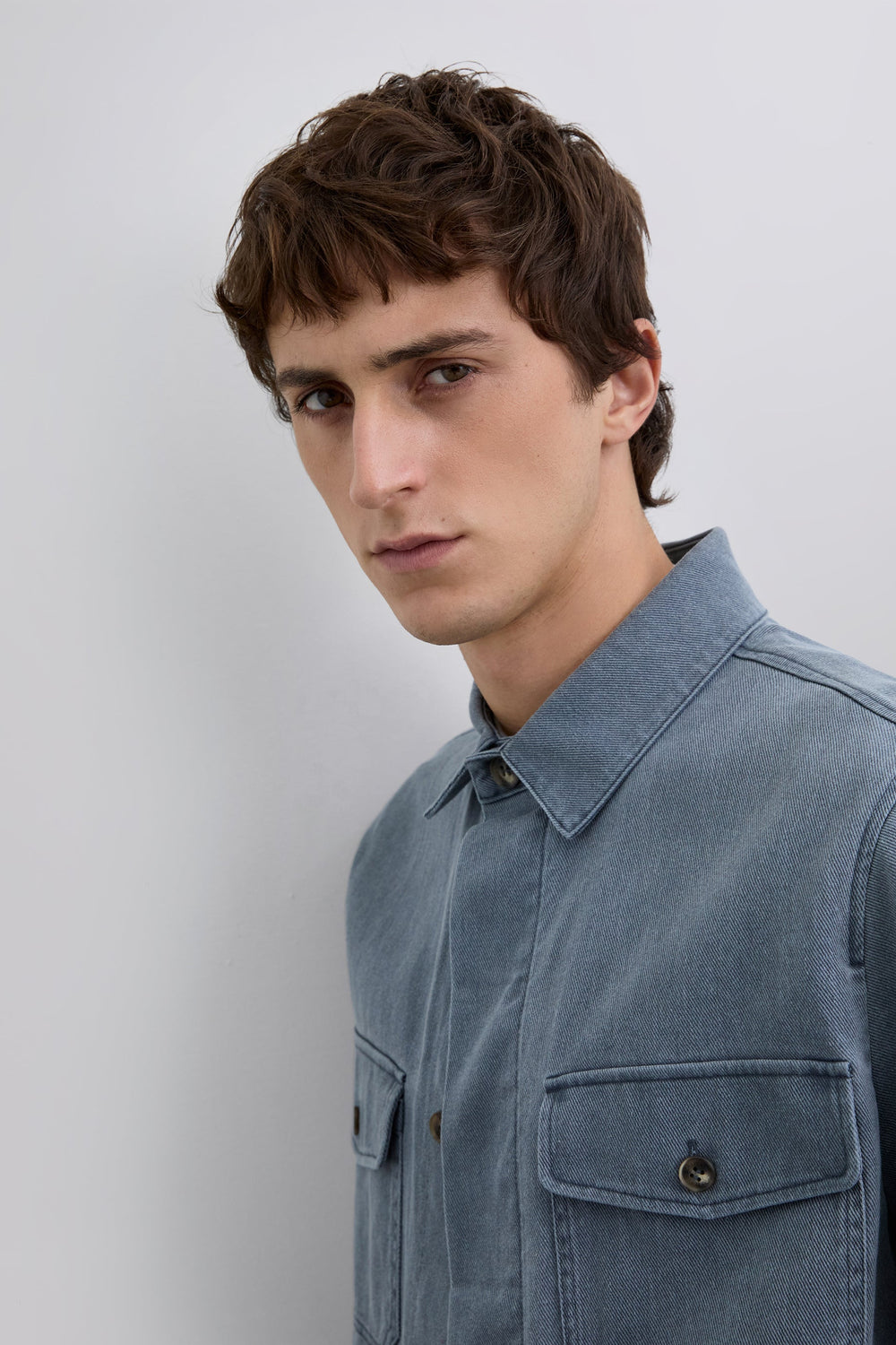 Jacket made of recycled cotton. Faded effect. Two flap pockets on the chest with button fastening. Front button fastening.