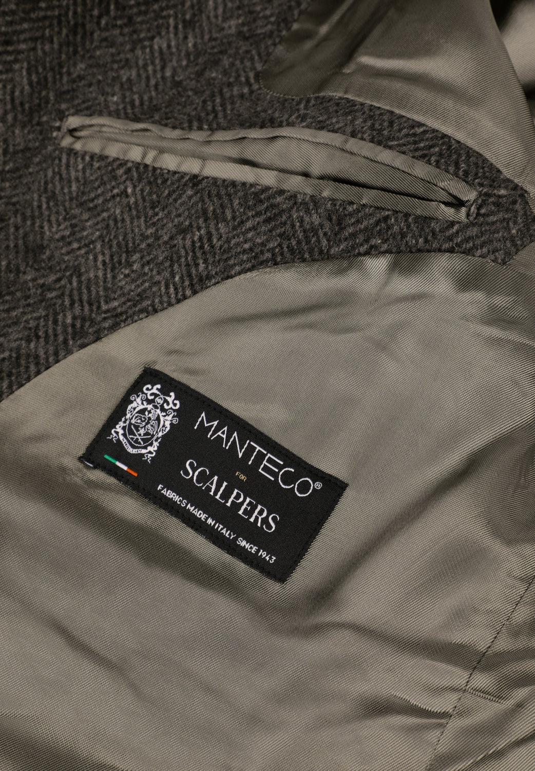 Jas van stof met visgraatmotief in bruintinten. Reverskraag. Dubbele klepzakken, knoopsluiting voor. Geborsteld effect.