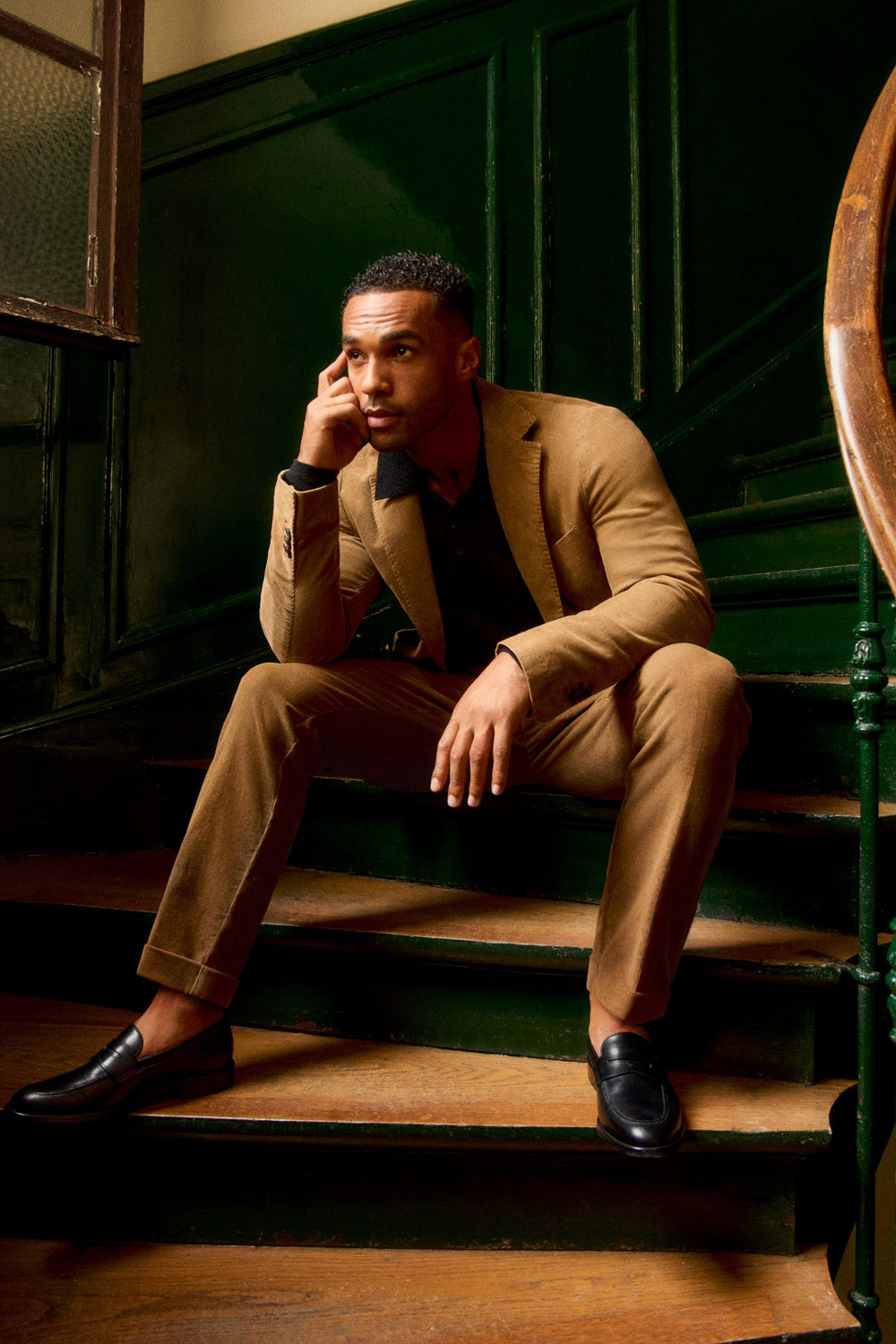 Corduroy chino broek. Loose fit met bandplooi. Ritssluiting met blinde rits en knoop tot in de taille. Steekzakken en achterzakken.