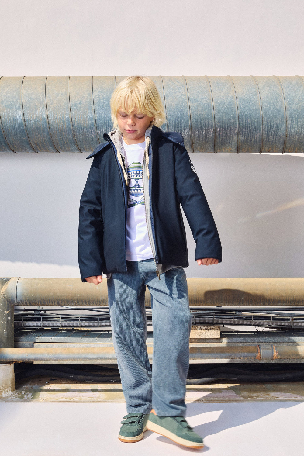Straight corduroy trousers made of a slightly stretch cotton blend fabric Button closure. Front and back slanted pockets. Back label detail with logo.