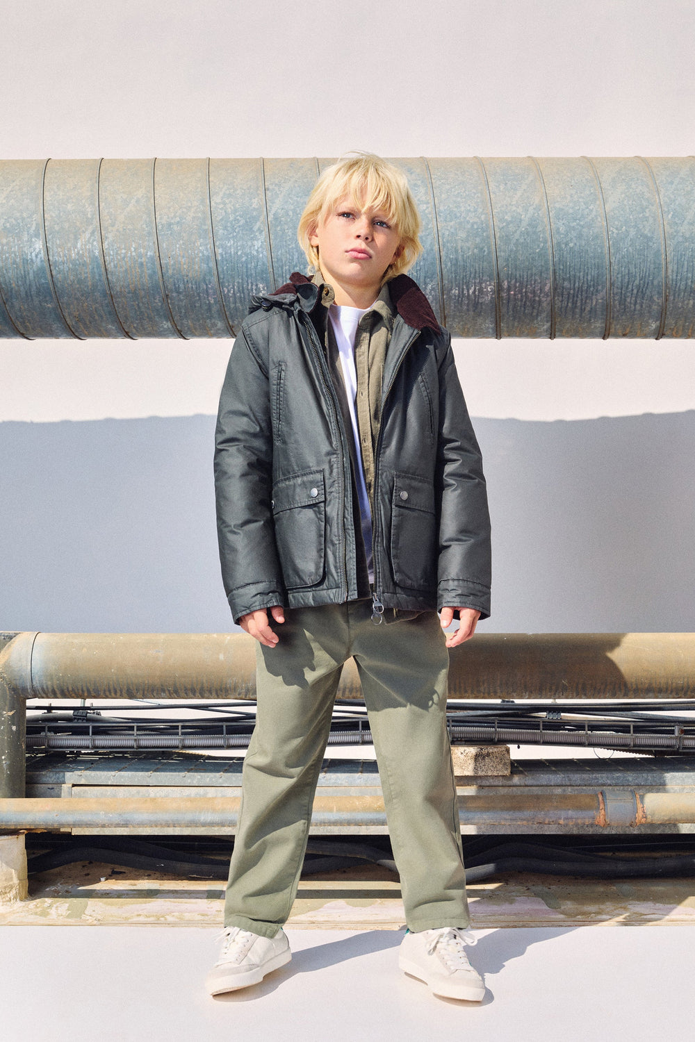 Parka van 100% BCI-katoen met gewaxt effect. Regular fit, ritssluiting en afneembare en verstelbare kraag met capuchon. Lange mouw en zakken met rits en drukknopen. Corduroy voering.