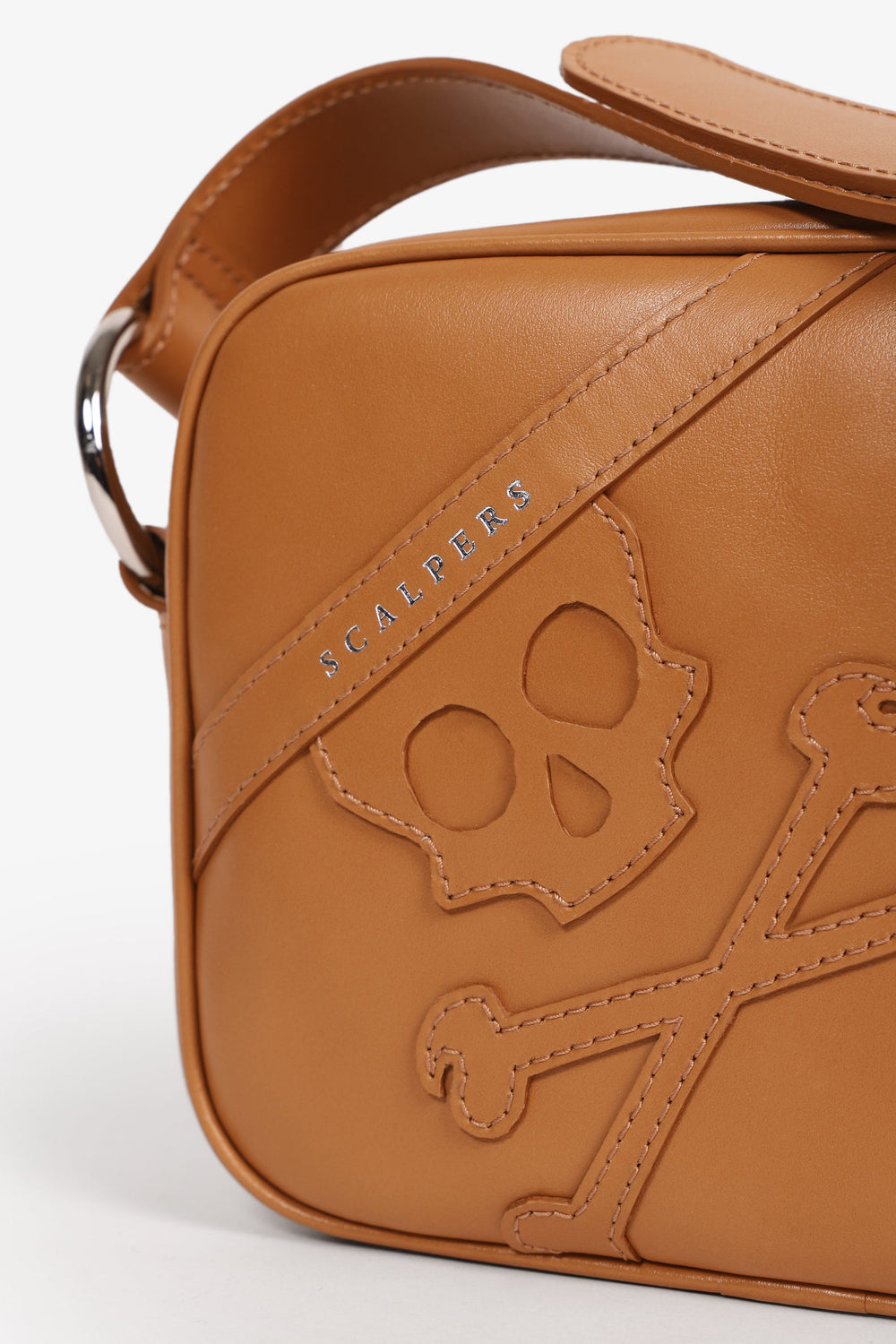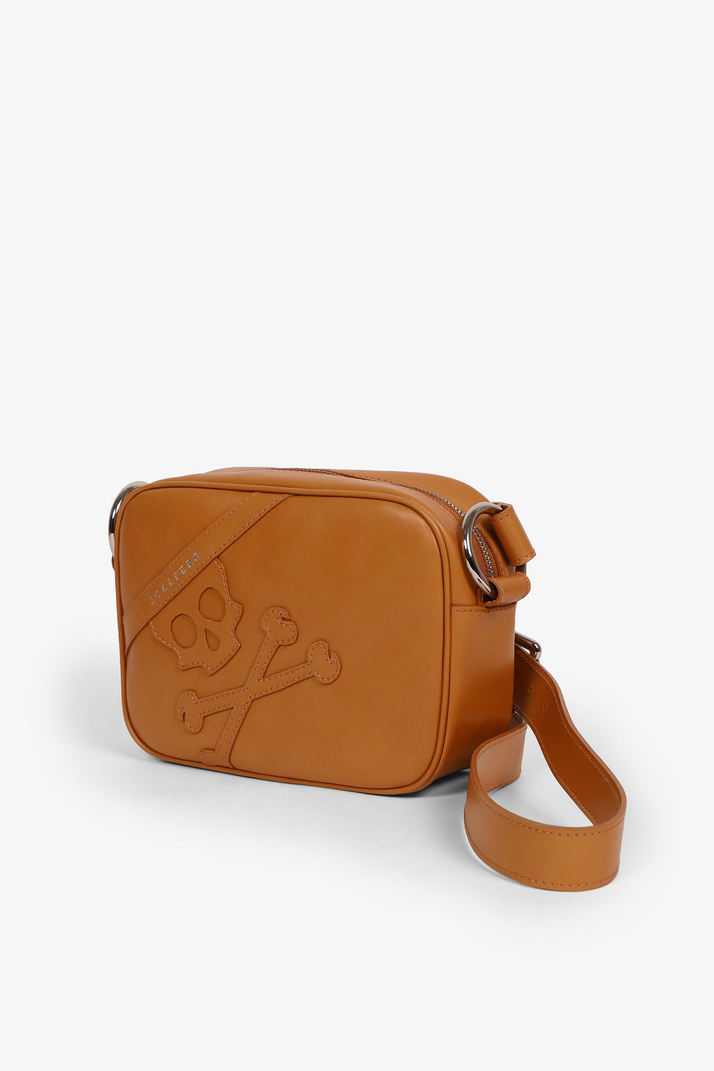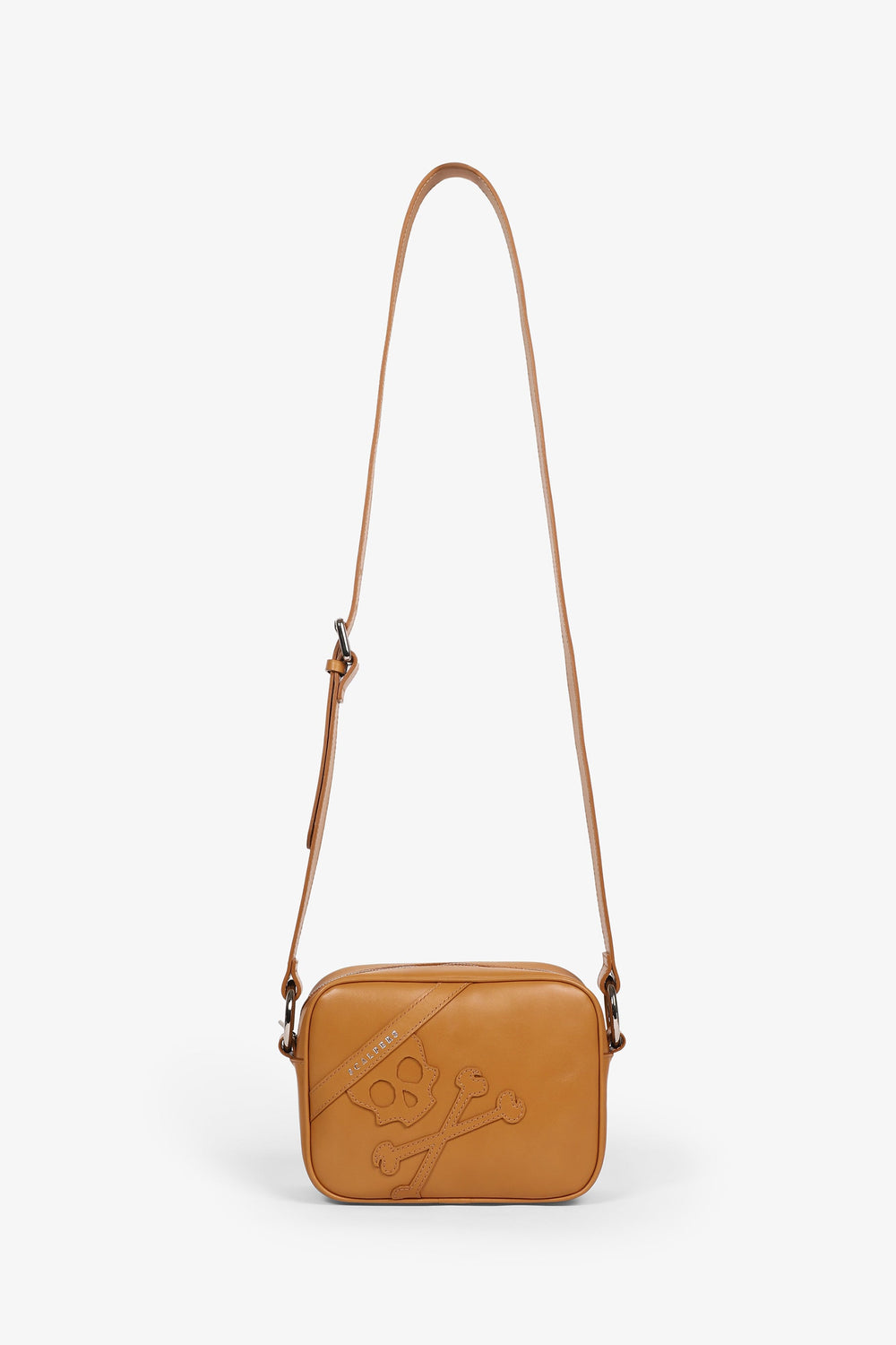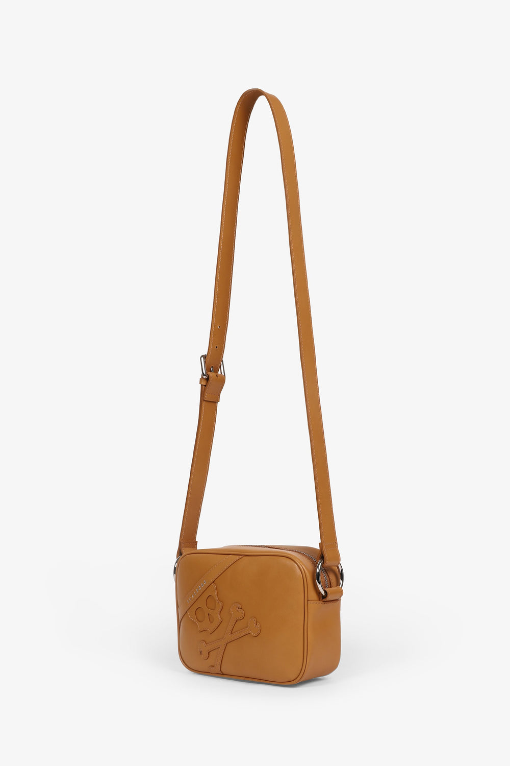 Leather bag with maxi skull. Zip fastening, long adjustable strap with buckle and metal rings.