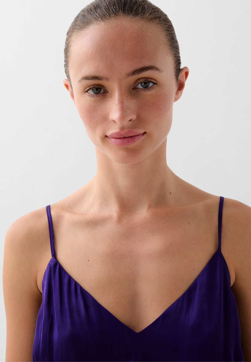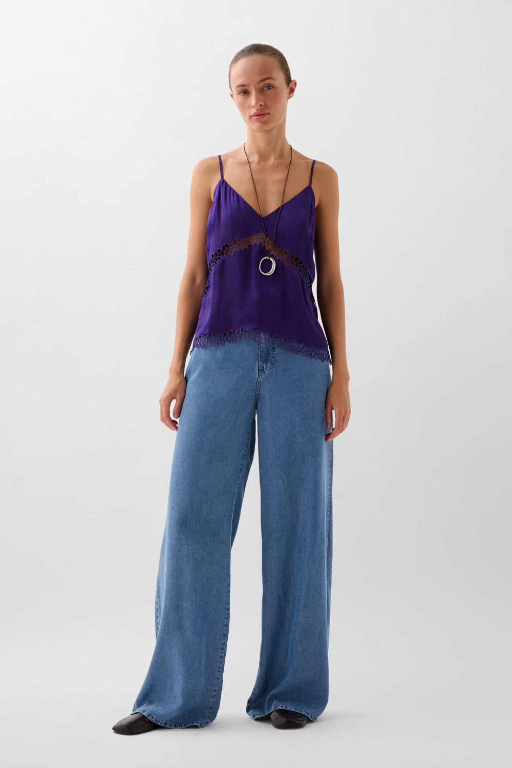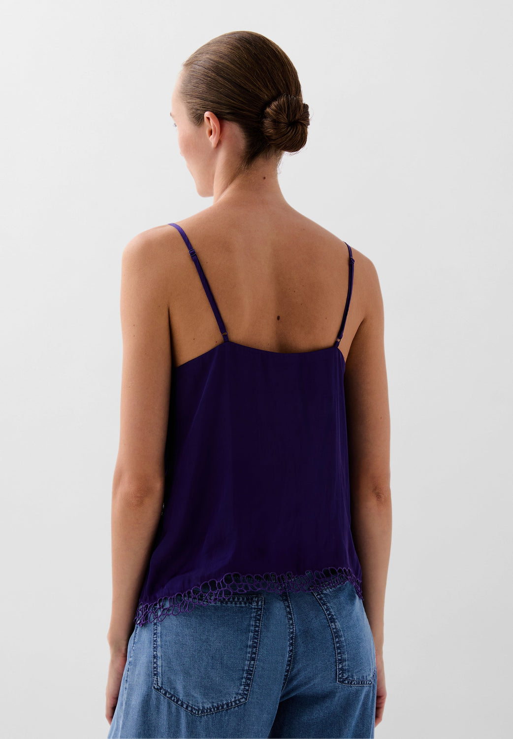 Top met soepelvallende bandjes. V-hals. Borduursel bij de halslijn en in de taille.