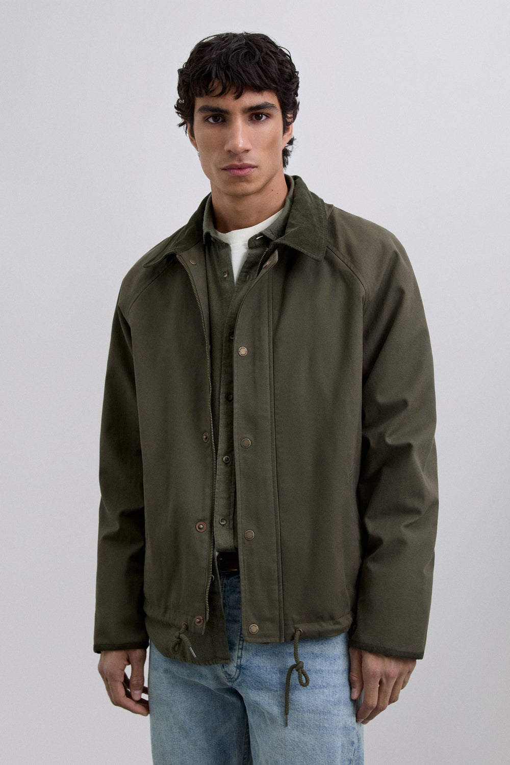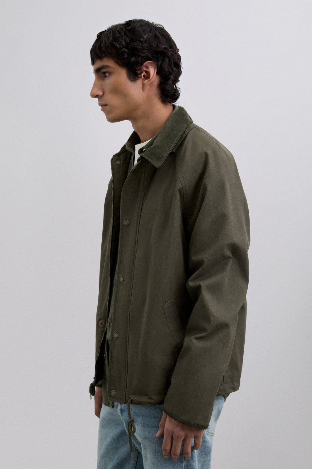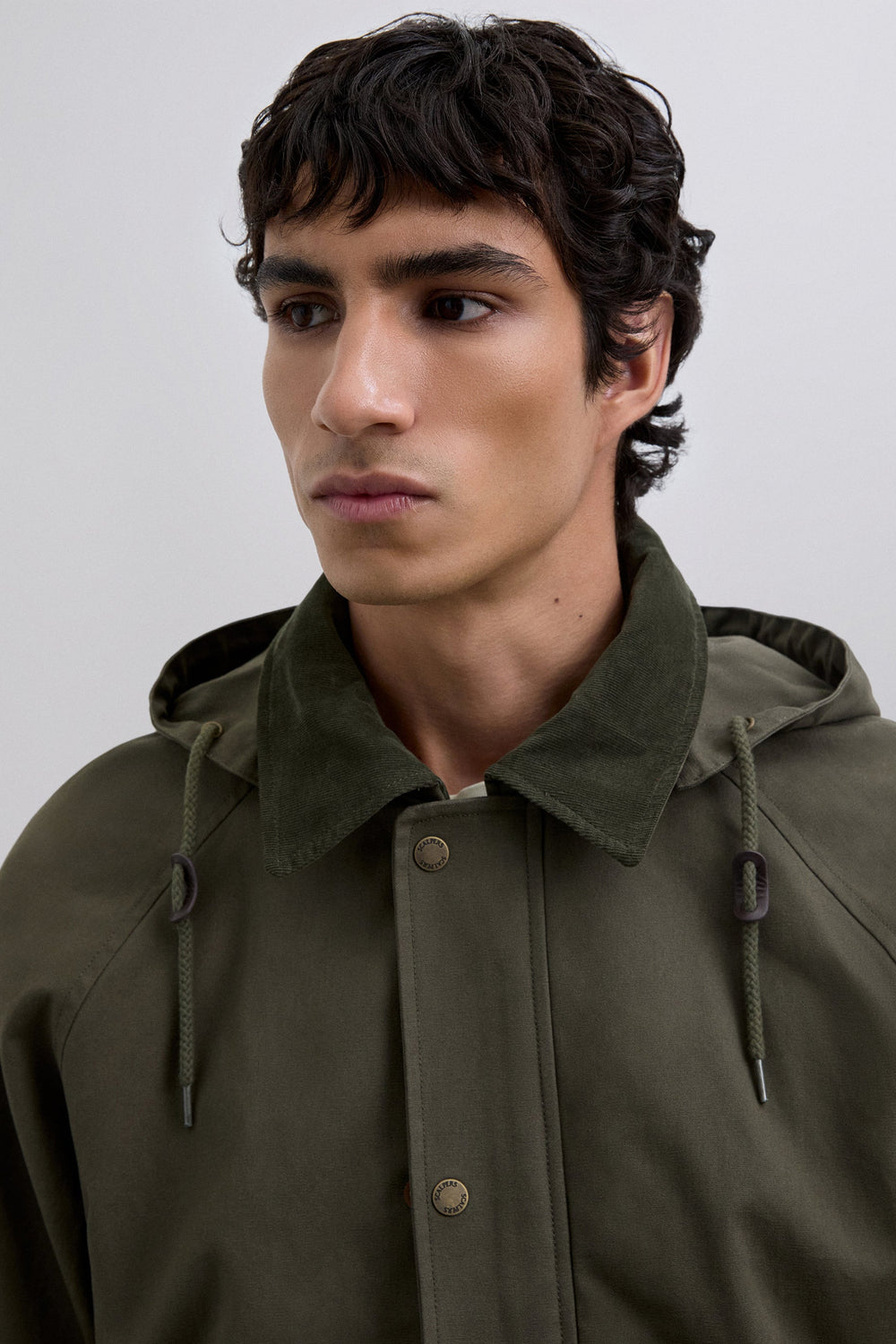 Jack gemaakt van 100% BCI-katoen. Verstelbare en afneembare capuchon. Sluiting met rits en knopen. Geribde binnenmanchetten. De biesjes van de mouw en de kraag zijn gemaakt van corduroy. Raglanmouwen. Twee zakken aan de voorkant. Logodetails op de rits.