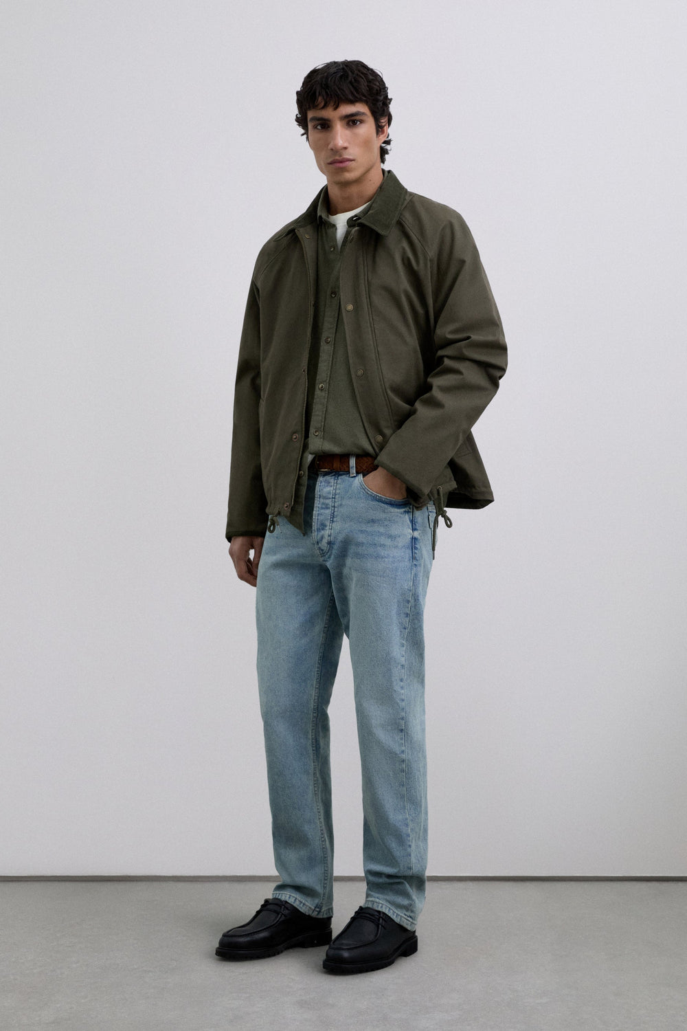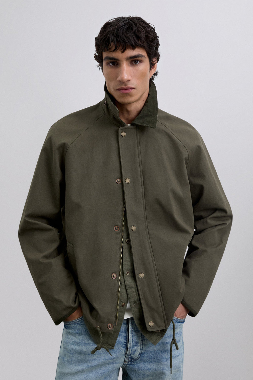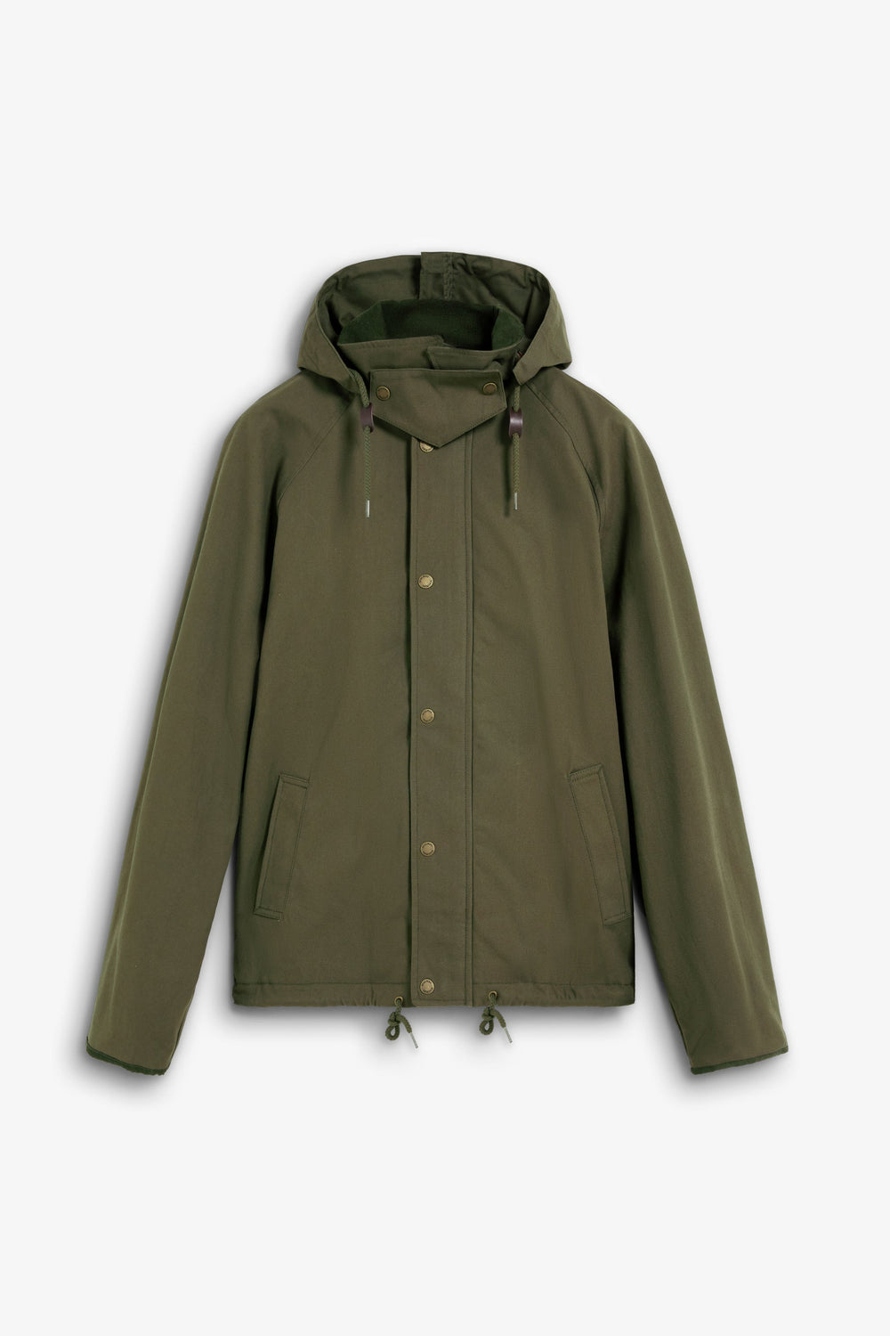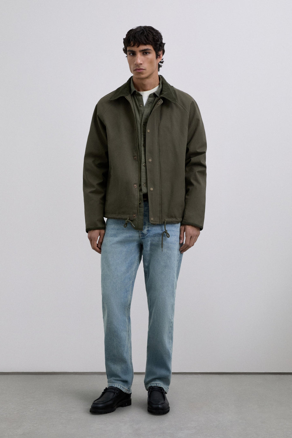 Jack gemaakt van 100% BCI-katoen. Verstelbare en afneembare capuchon. Sluiting met rits en knopen. Geribde binnenmanchetten. De biesjes van de mouw en de kraag zijn gemaakt van corduroy. Raglanmouwen. Twee zakken aan de voorkant. Logodetails op de rits.