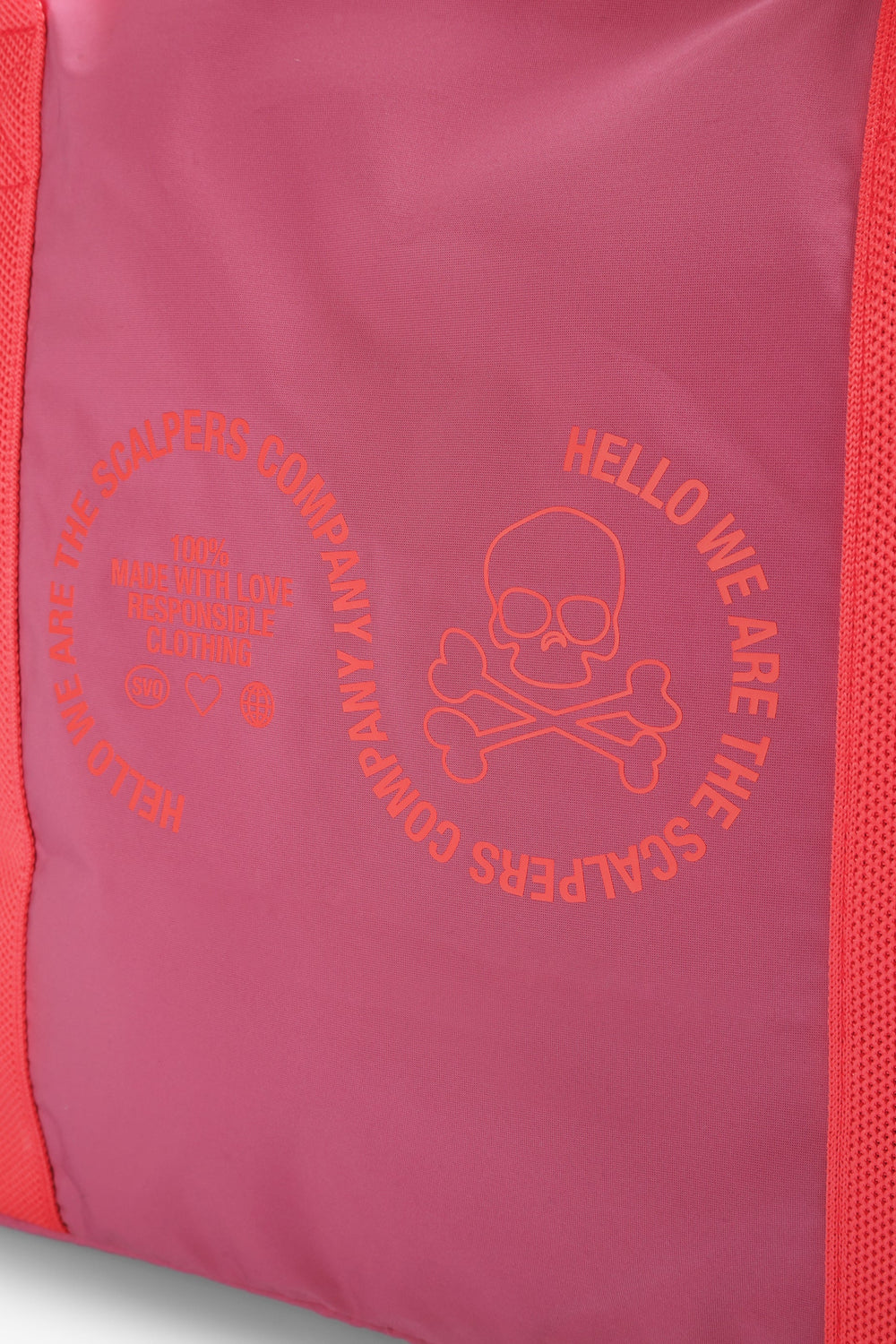 Synthetische tas met dubbel hengsel. Sluiting met tweewegrits. Logo aan de binnenkant. Voor- en achterkant bedrukt met logo en doodshoofd.