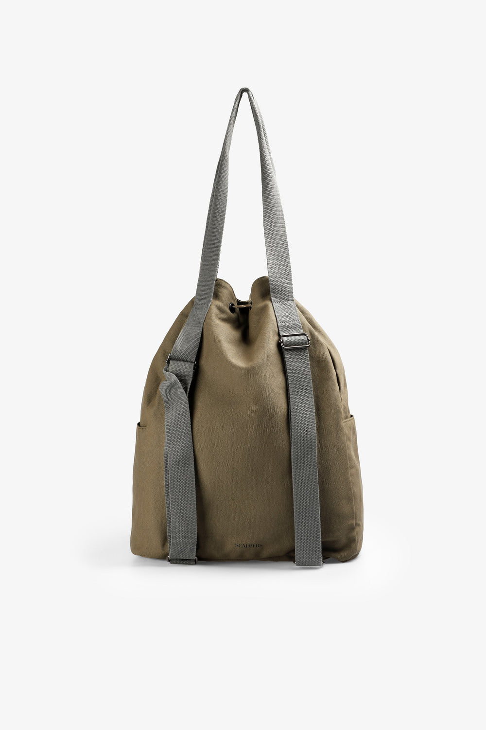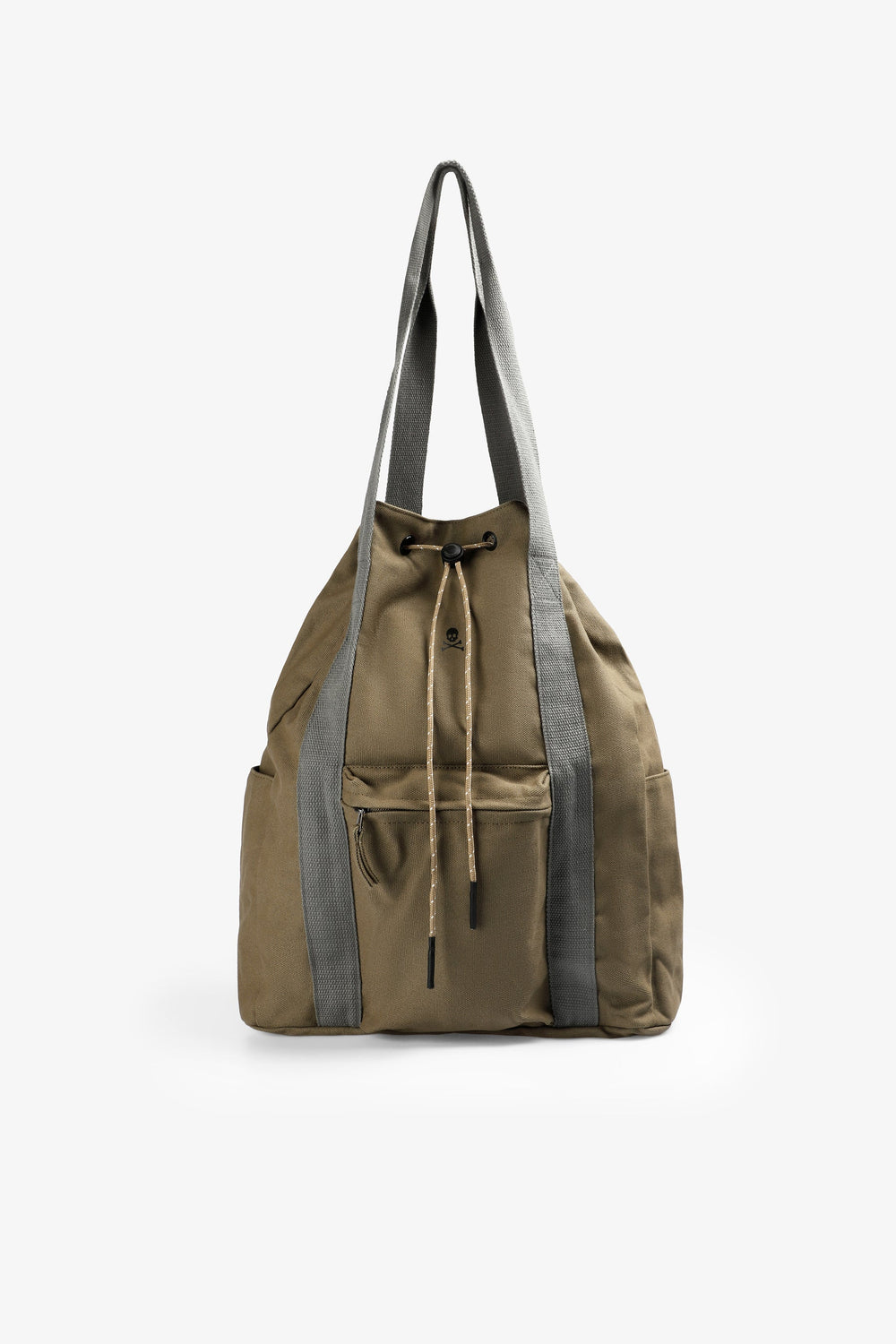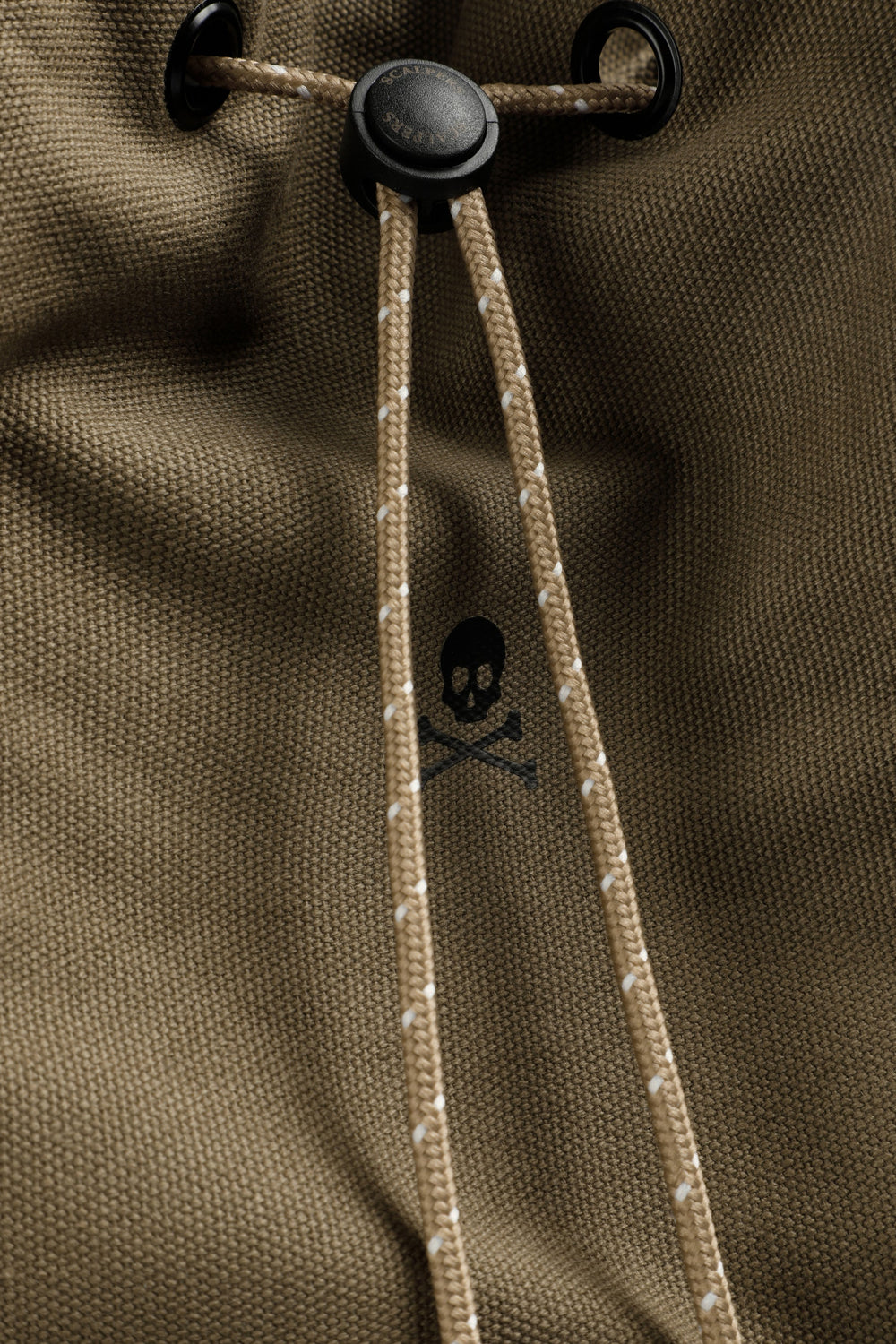 Tas gemaakt van 100% katoen. Dubbel hengsel. Verstelbare ritssluiting, binnenzak en buitenzak met vouw. Contrasterend logo en doodskop.