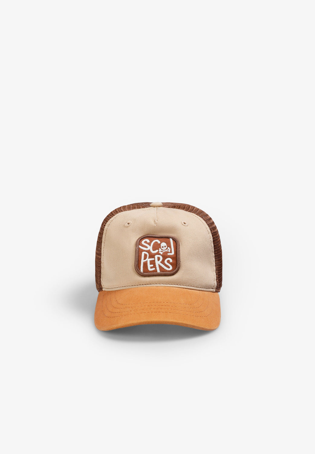 Trucker-stijl pet van katoenmix en technische stof met achterkant van gaas. Vizier en geborduurde doodshoofdpatch en contrasterend logo.
