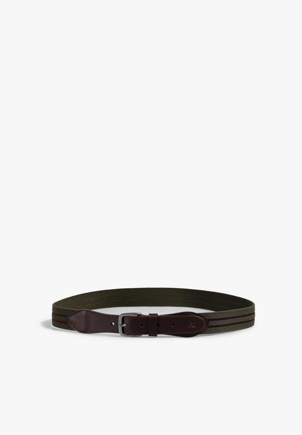 Riem van leer. Sluiting met verstelbare gesp. Geborduurd ton sur ton doodshoofd.