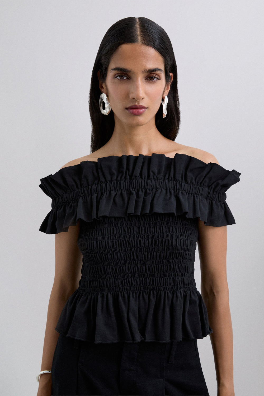 Top gemaakt van 100% BCI-katoen. Slim fit. Off the shoulder met plooien en ruches. Body met honingraatmotief.