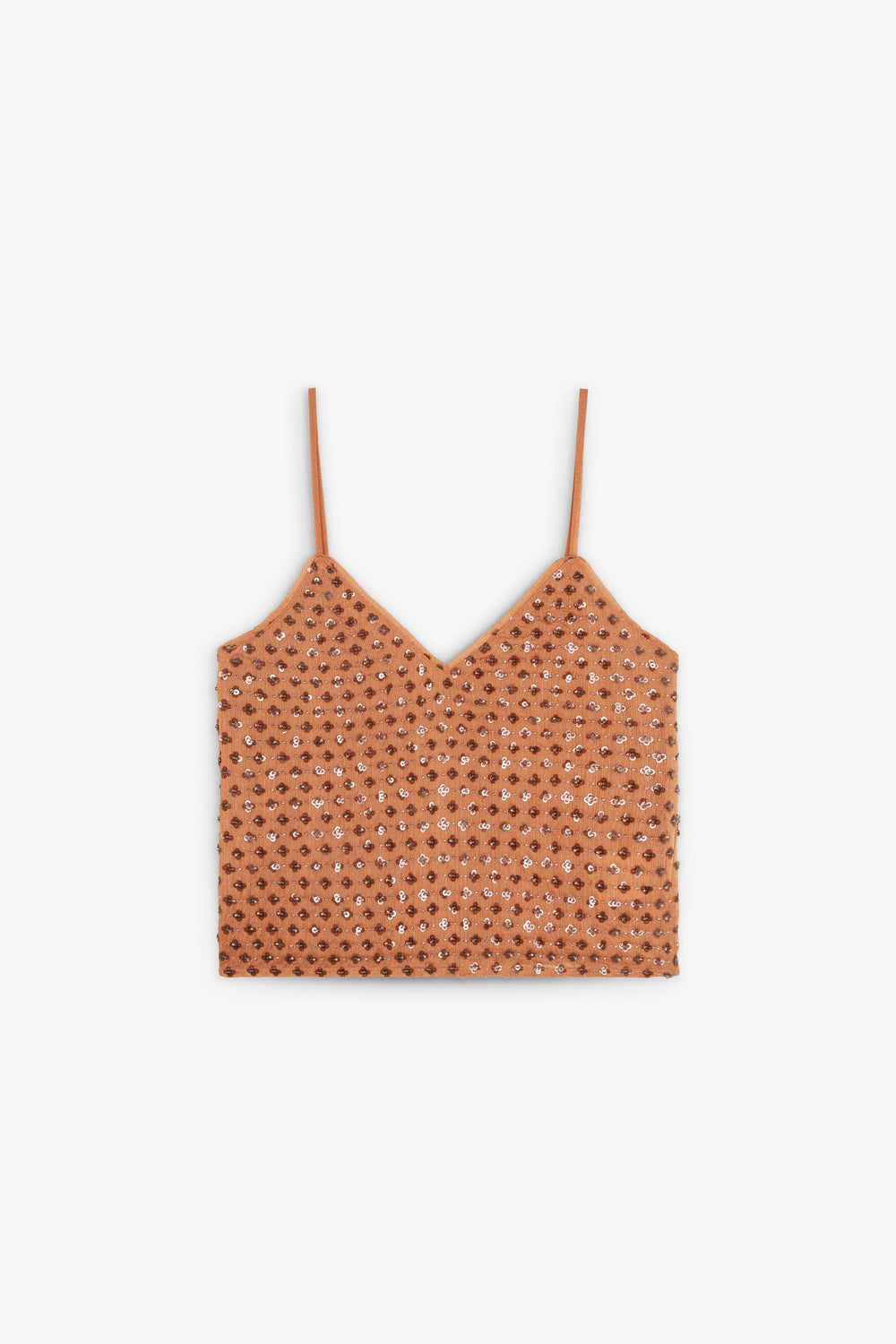 Top met V-hals en dunne bandjes. Pailletten applicatie. Ritssluiting aan de zijkant.