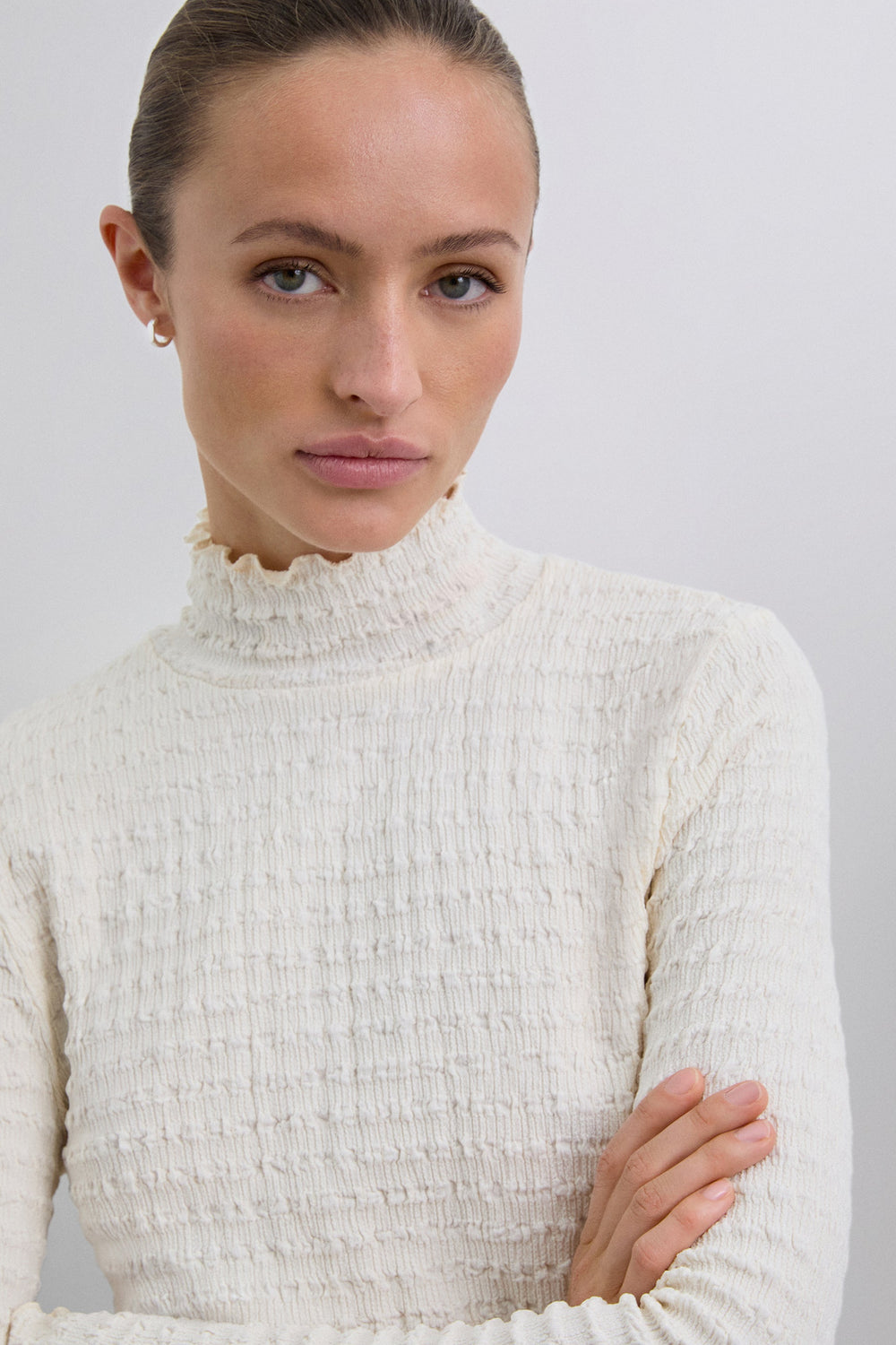Top met hoge kraag en lange mouw. Lichtgewicht stof met geplooide structuur.